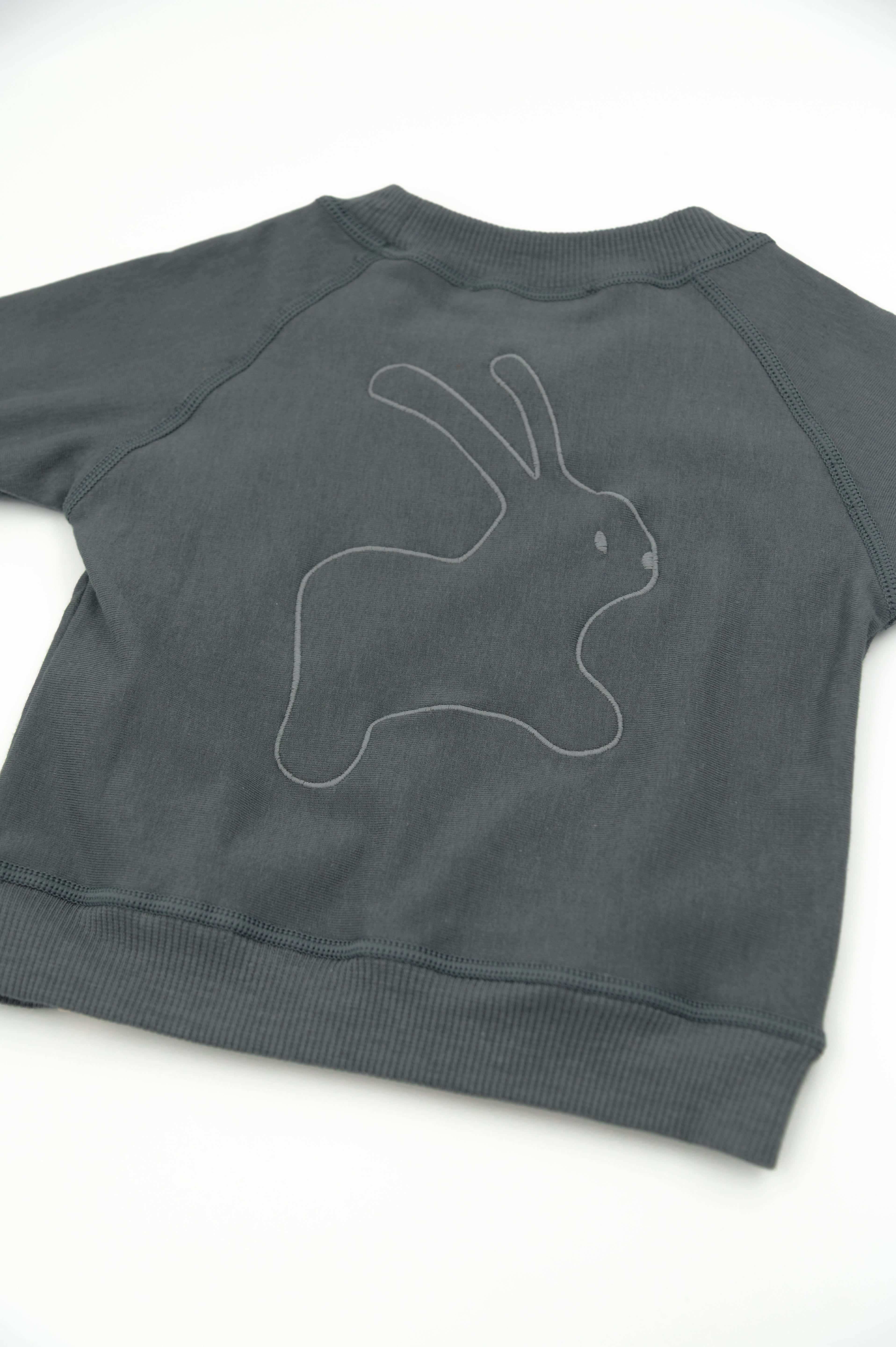 The embossed bunny embroidery on the chest adds a playful yet refined detail, while the elastic cuffs and hem provide a snug, secure fit for active days.