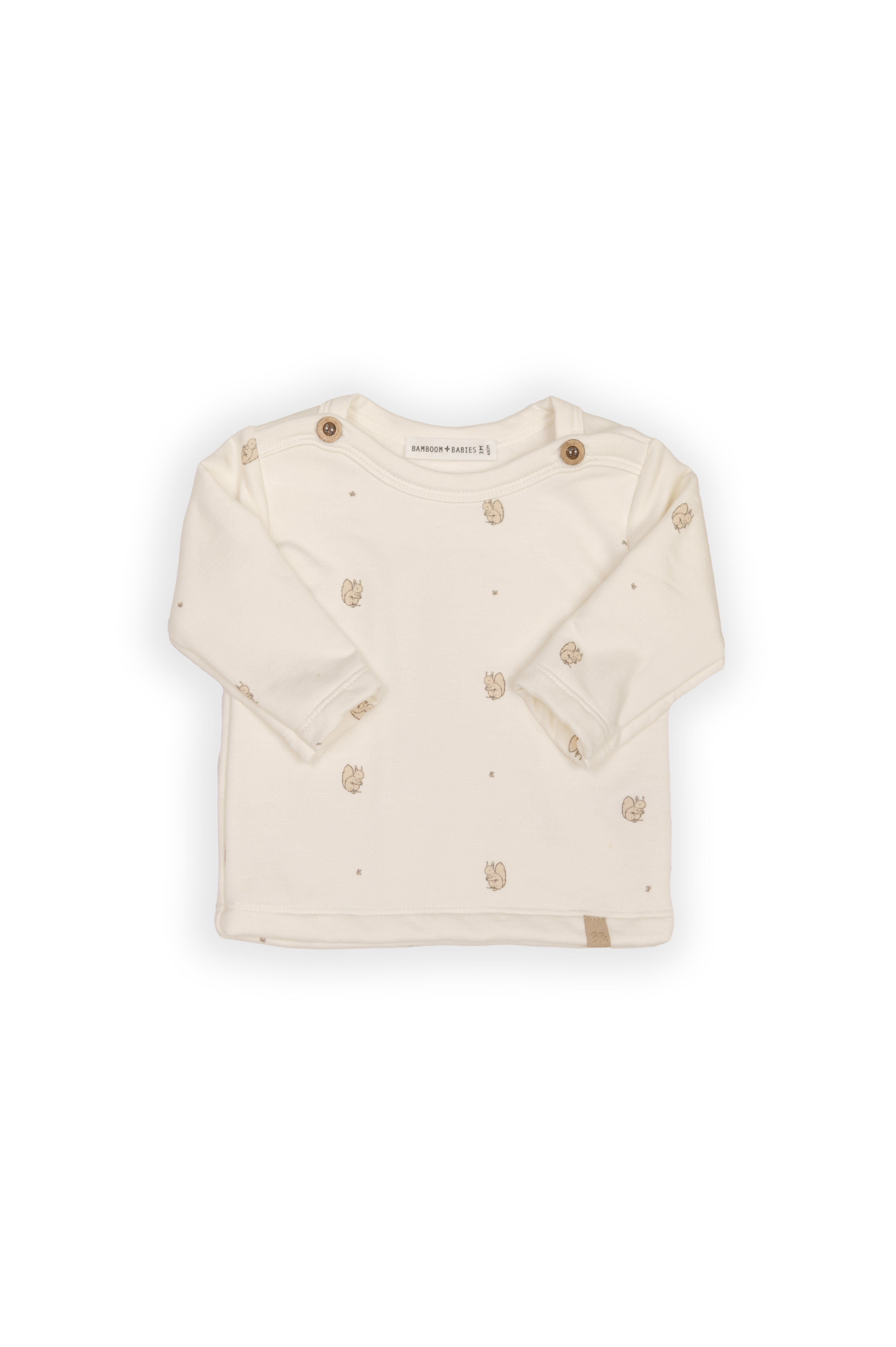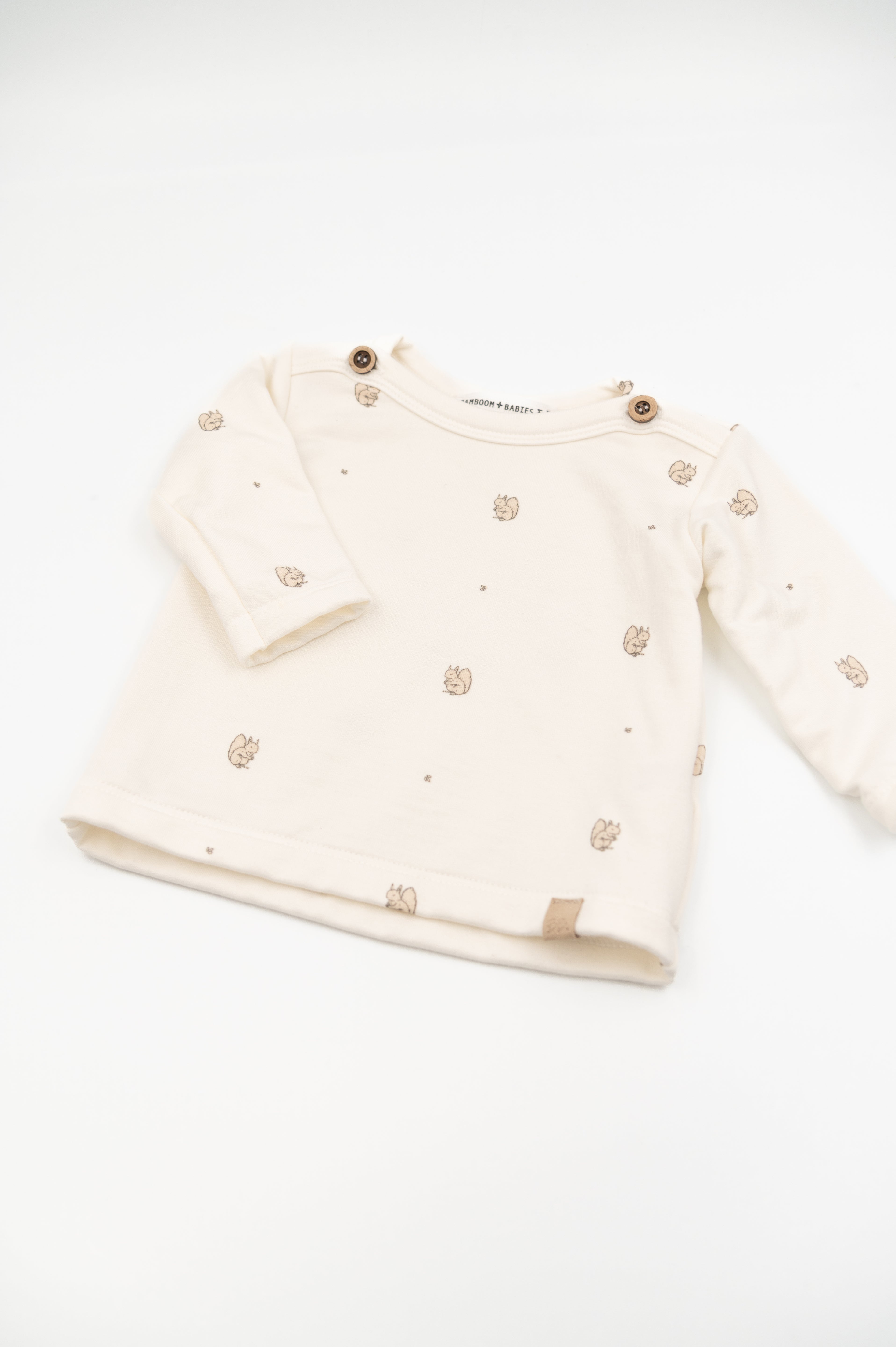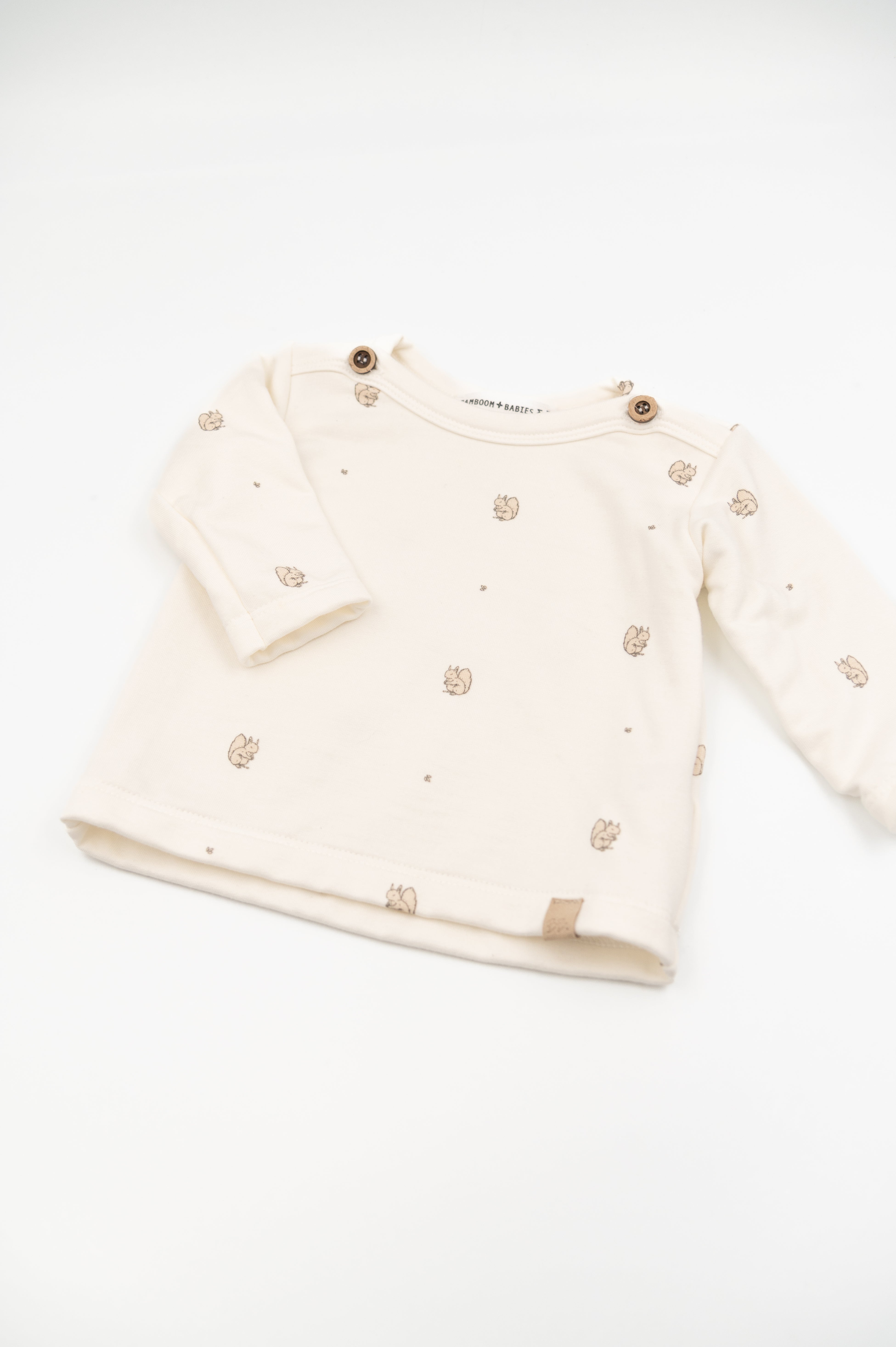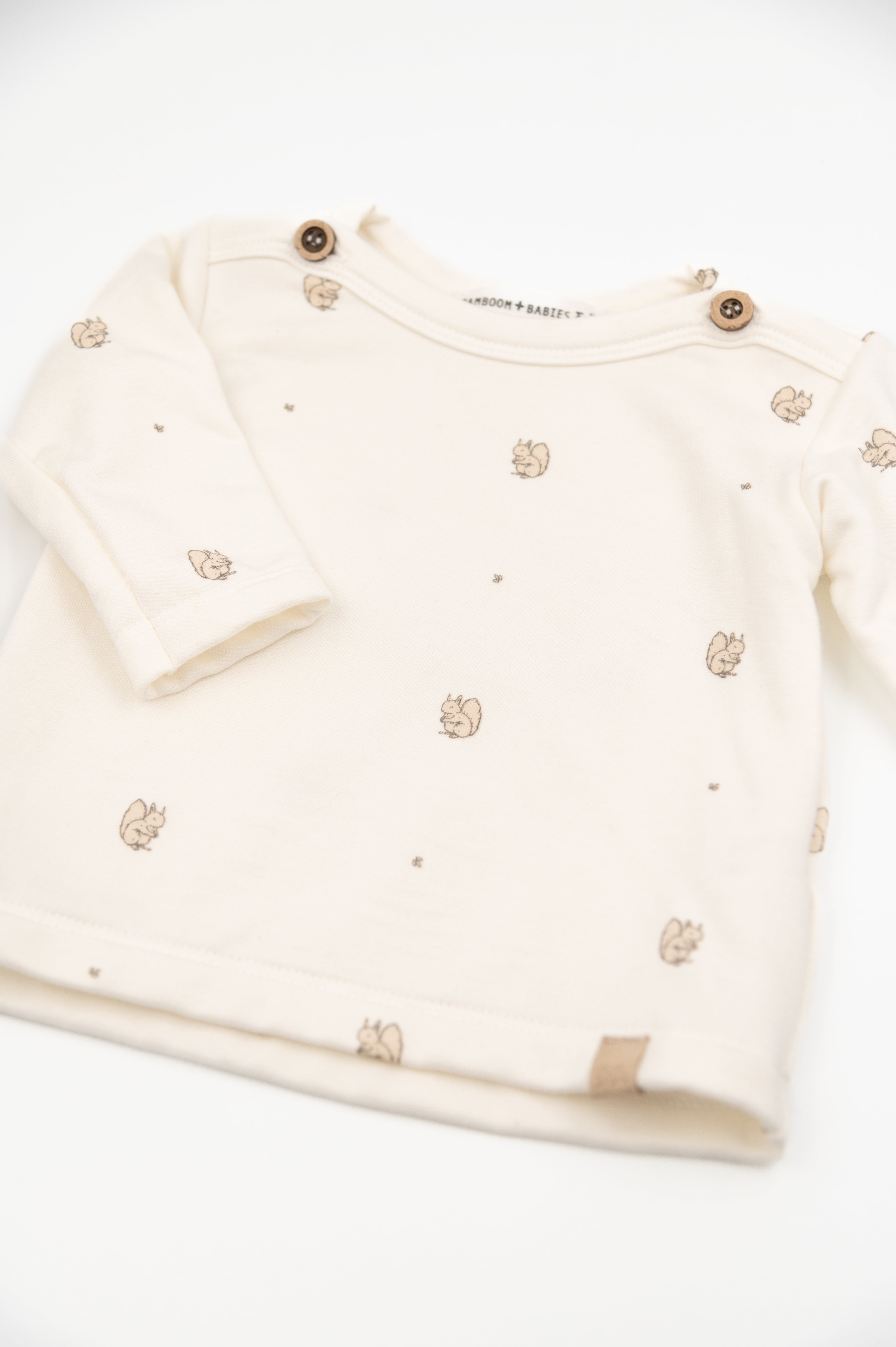 The subtle squirrel print and neutral, natural shades make it easy to pair with any outfit, perfect under a jumpsuit or matched with soft pants.
