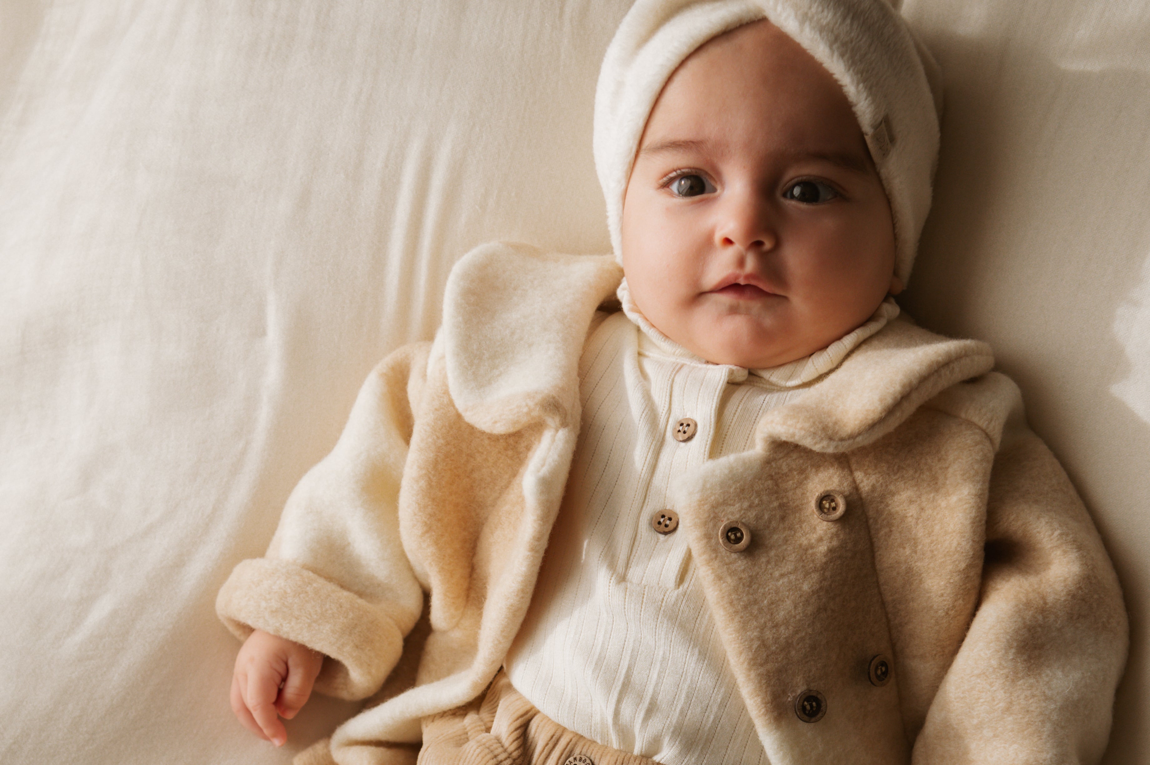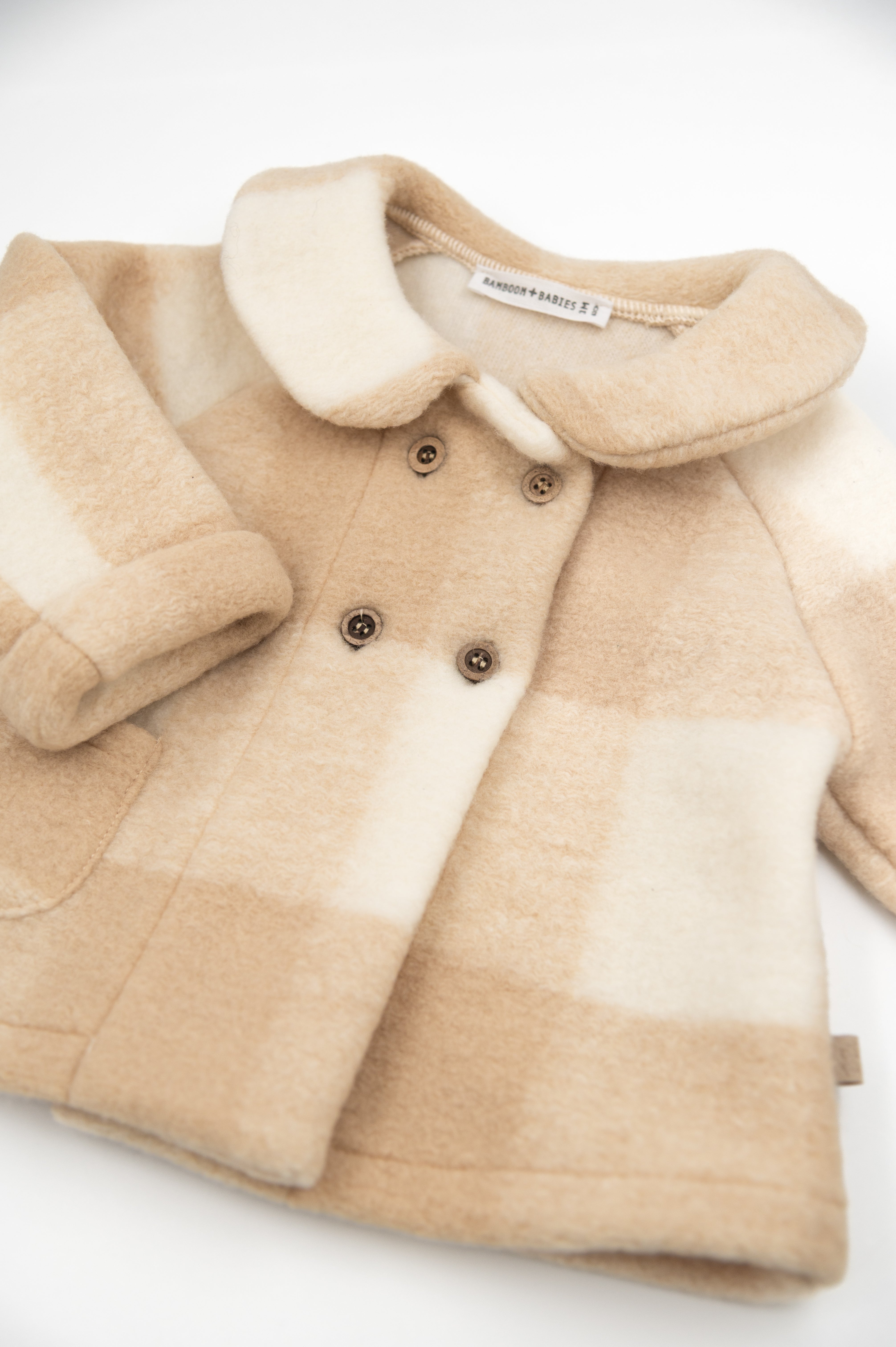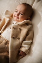 Elegant and cosy, this boiled wool coat is designed to keep little ones warm on cooler days while maintaining a sophisticated look. The round collar and front button closure lend it a classic, timeless charm, perfect for both everyday wear and special occasions.