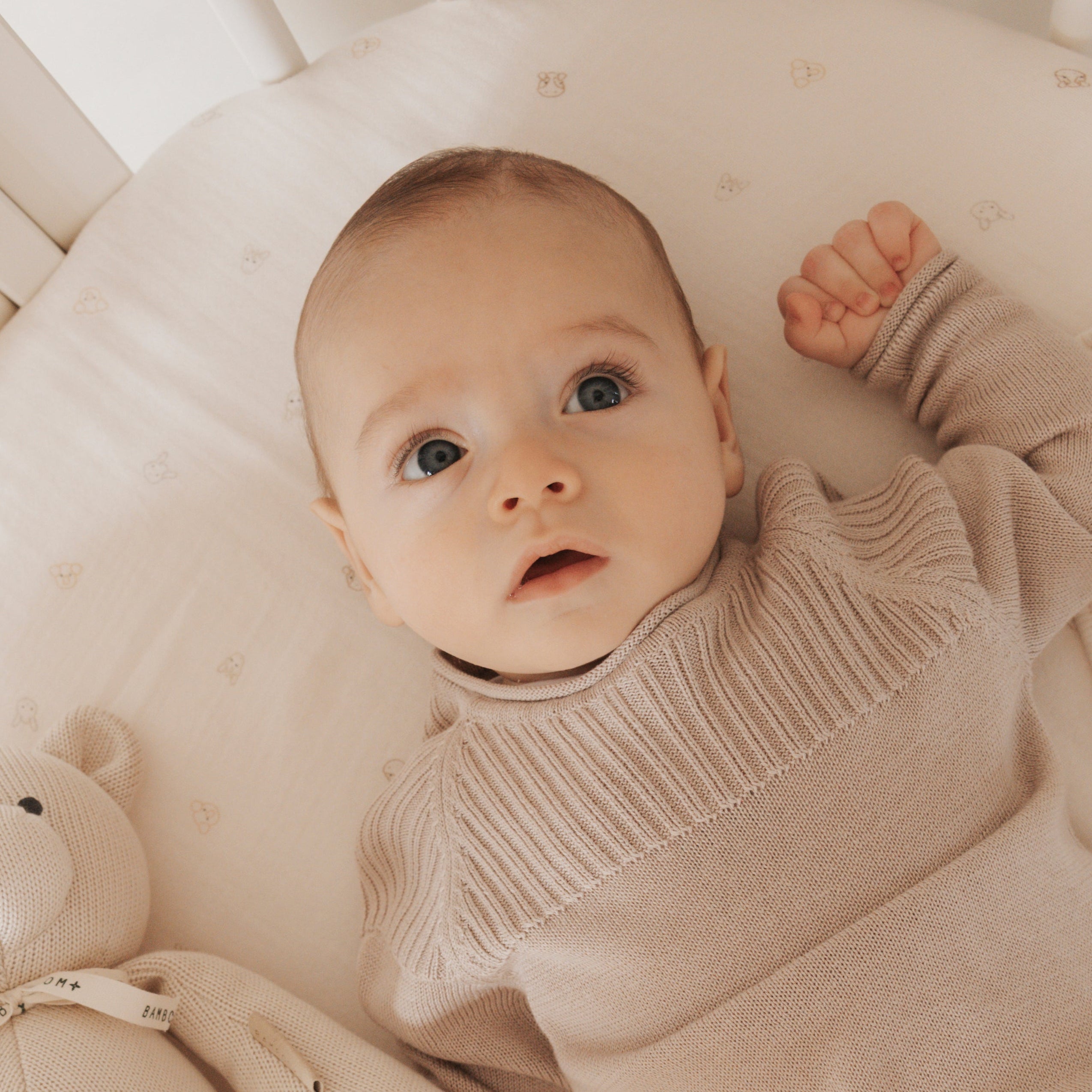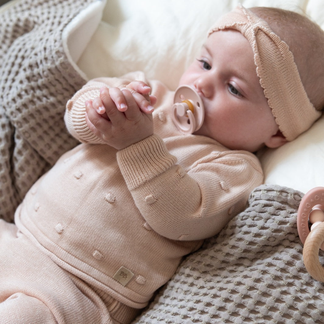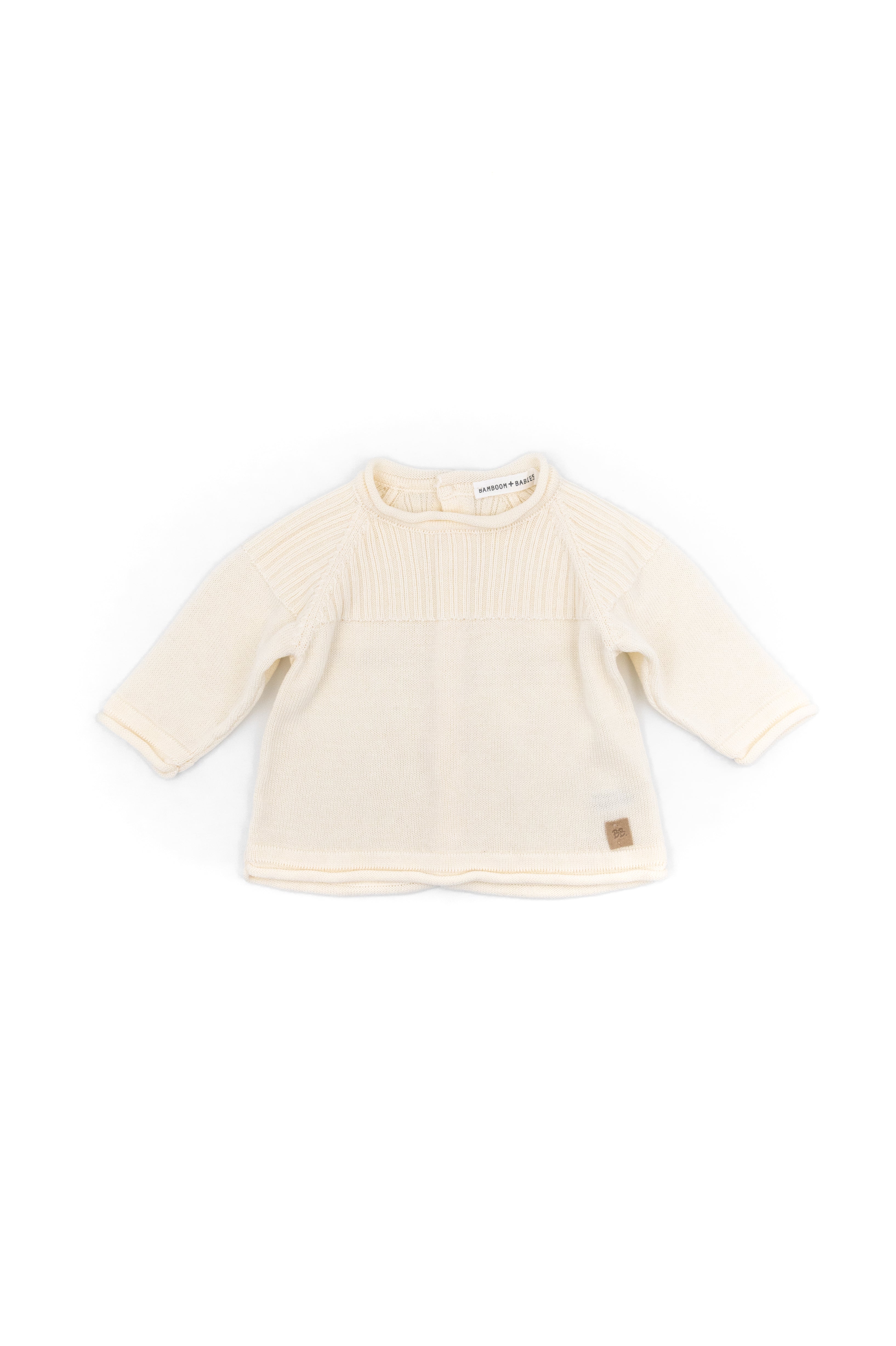 Perfect for your baby’s first outfit, this soft ribbed knitted set is crafted from natural bamboo yarn with thermo-regulating properties to keep your little one comfortable all year round. The sweater features an open-back design with delicate buttons, making dressing and changing effortless. Its fine rib texture adds a timeless touch of style, while the matching white knitted pants complete the look with elegance and cosiness, ideal for newborns and special moments.