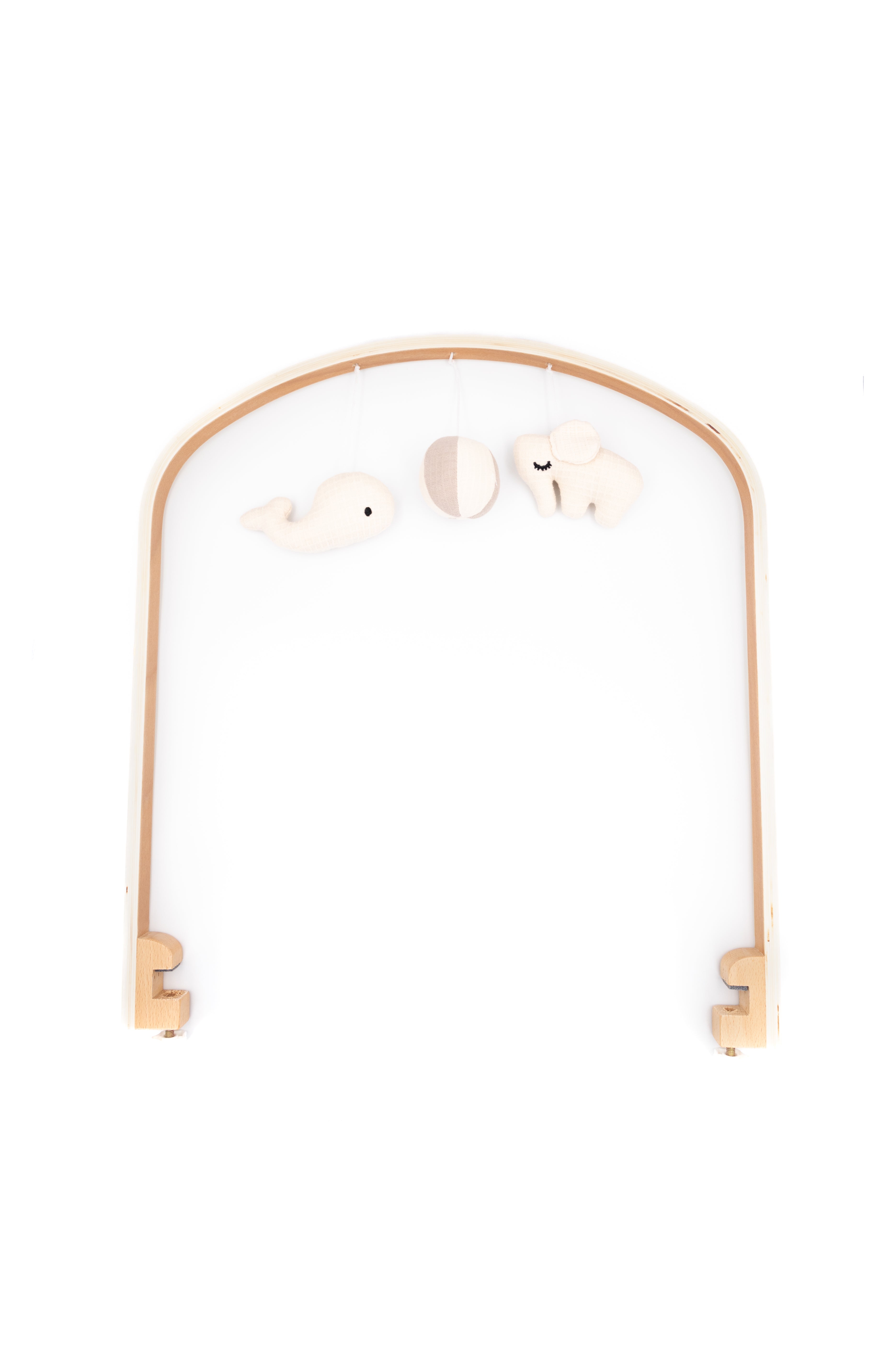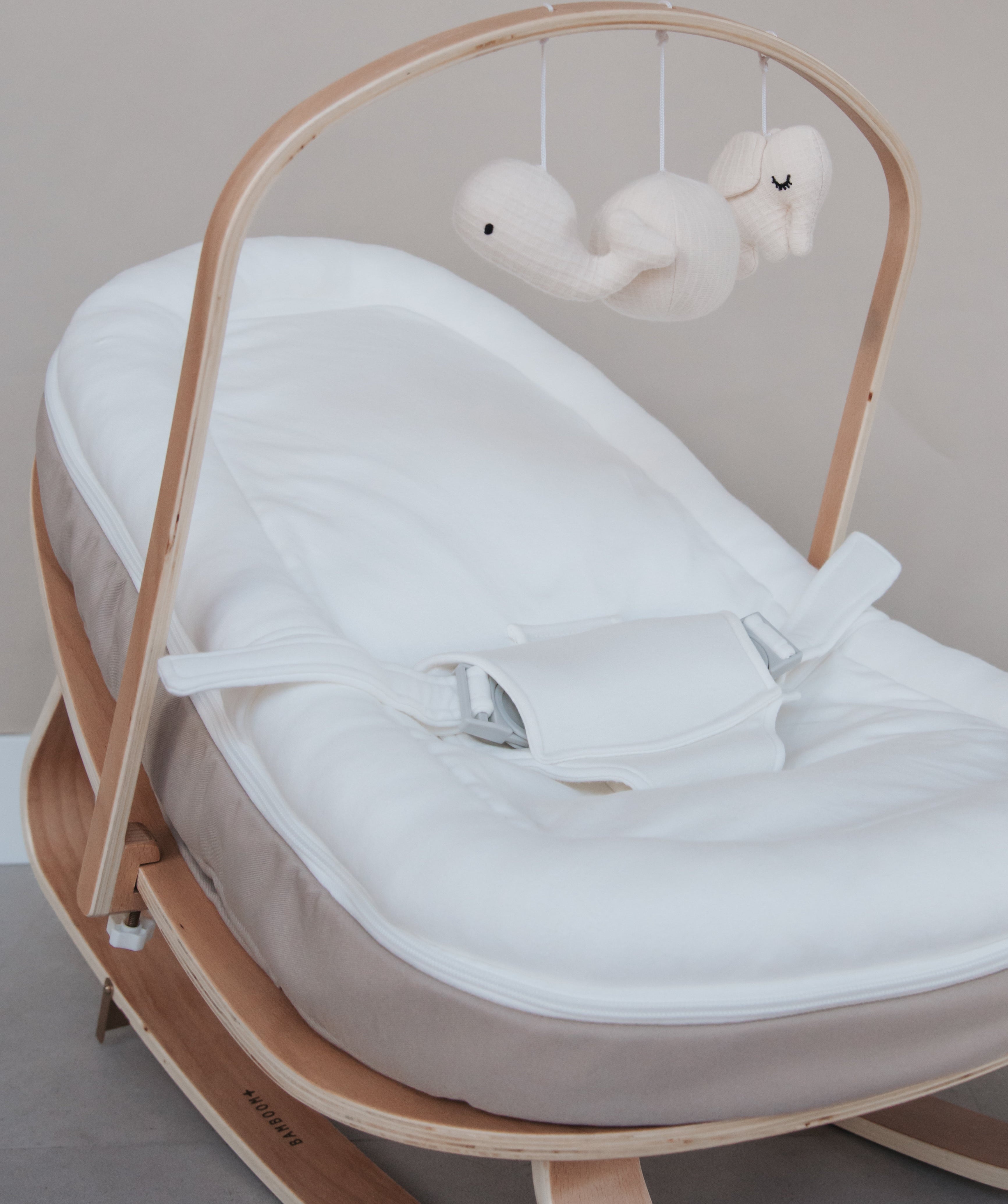The included toy bar with bamboo toys is designed to gently stimulate your baby’s senses in total safety. Made from natural wood and soft bamboo materials, it perfectly complements the bouncer’s design and supports moments of calm play and discovery.