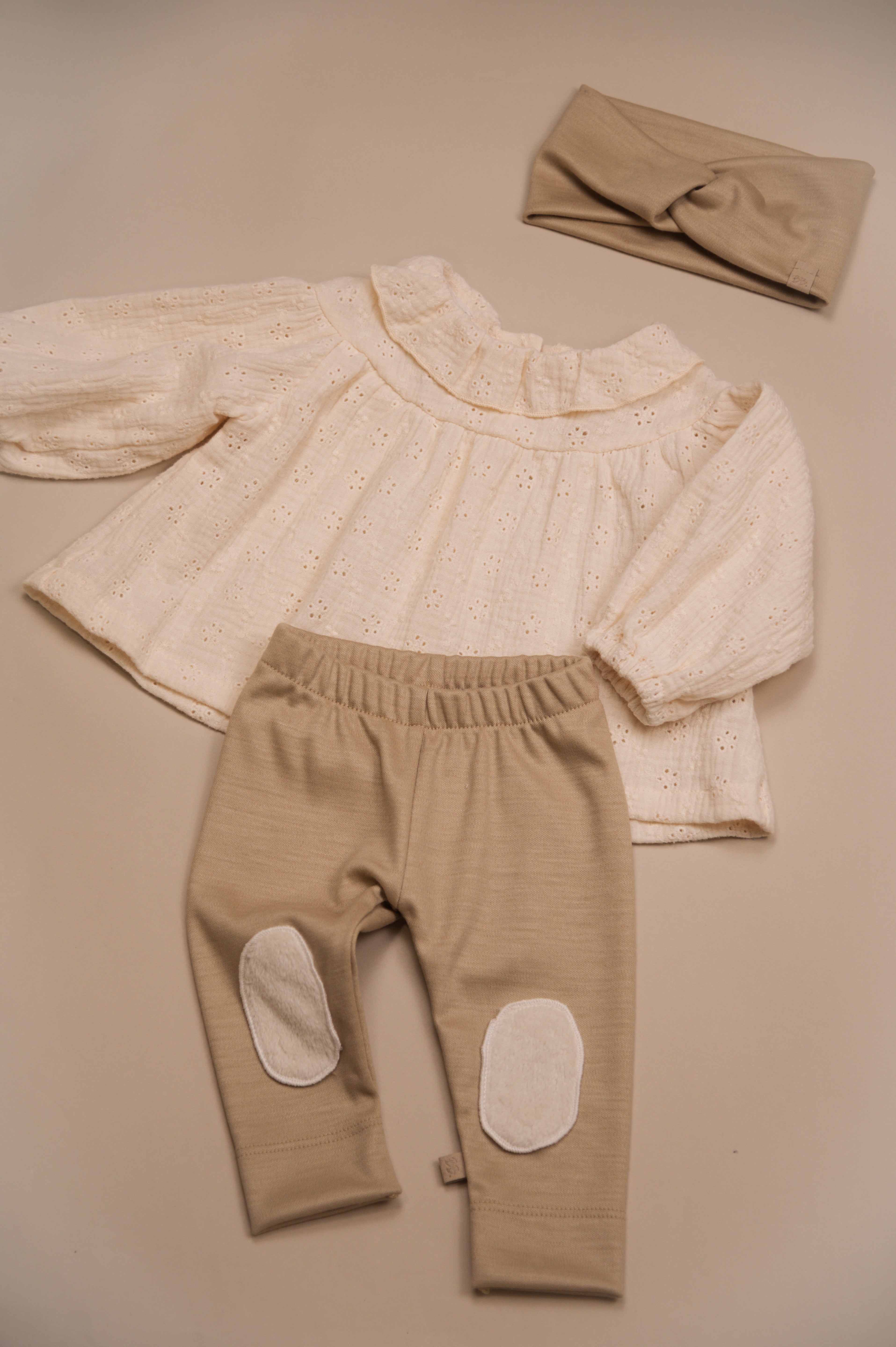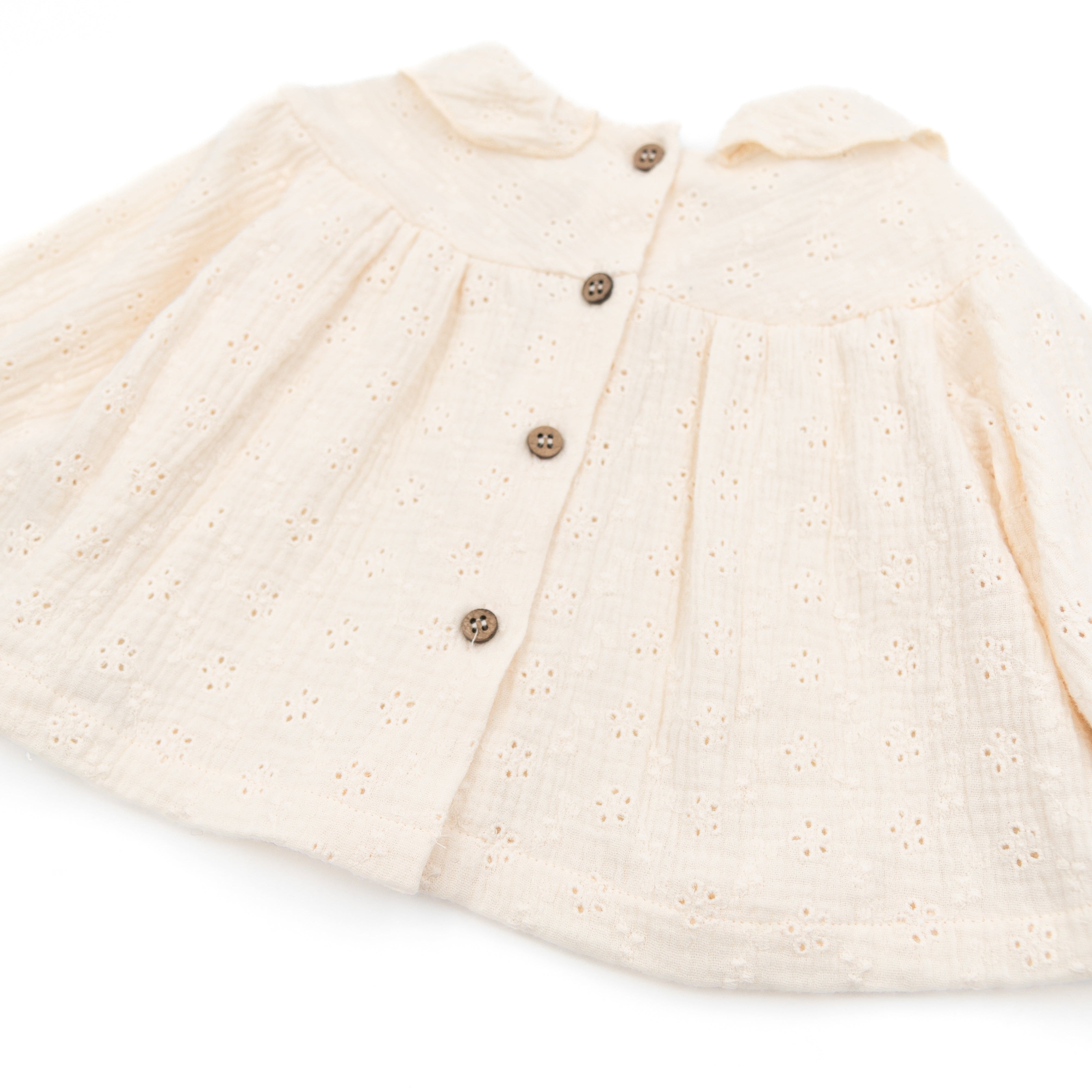 The back button closure makes dressing quick and easy, while the versatile design pairs beautifully with leggings, pants or dungarees. A sustainable and detail-oriented piece, offering timeless elegance and comfort, both crafted from naturally sourced bamboo and cotton fabrics that are gentle, breathable and kind to delicate skin.