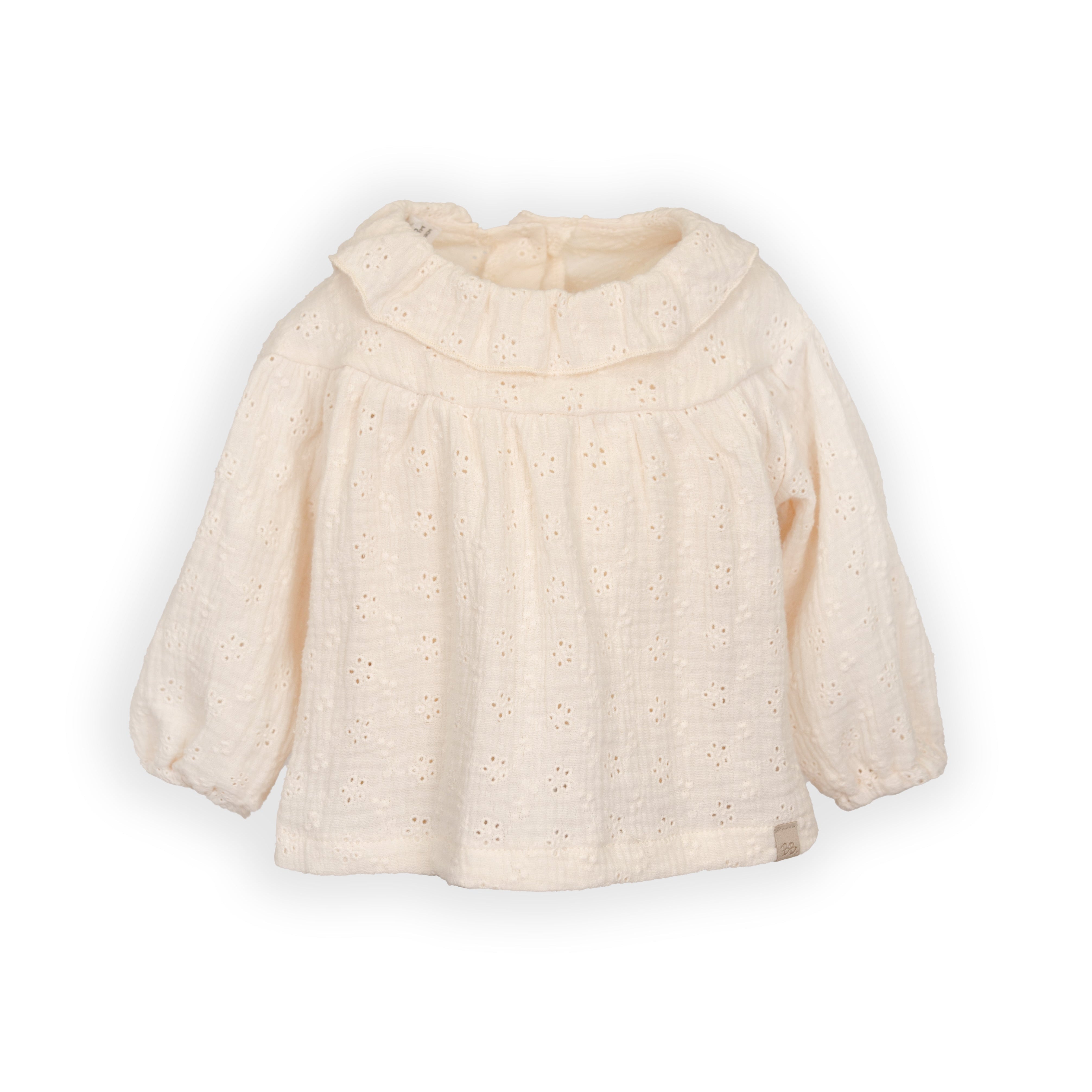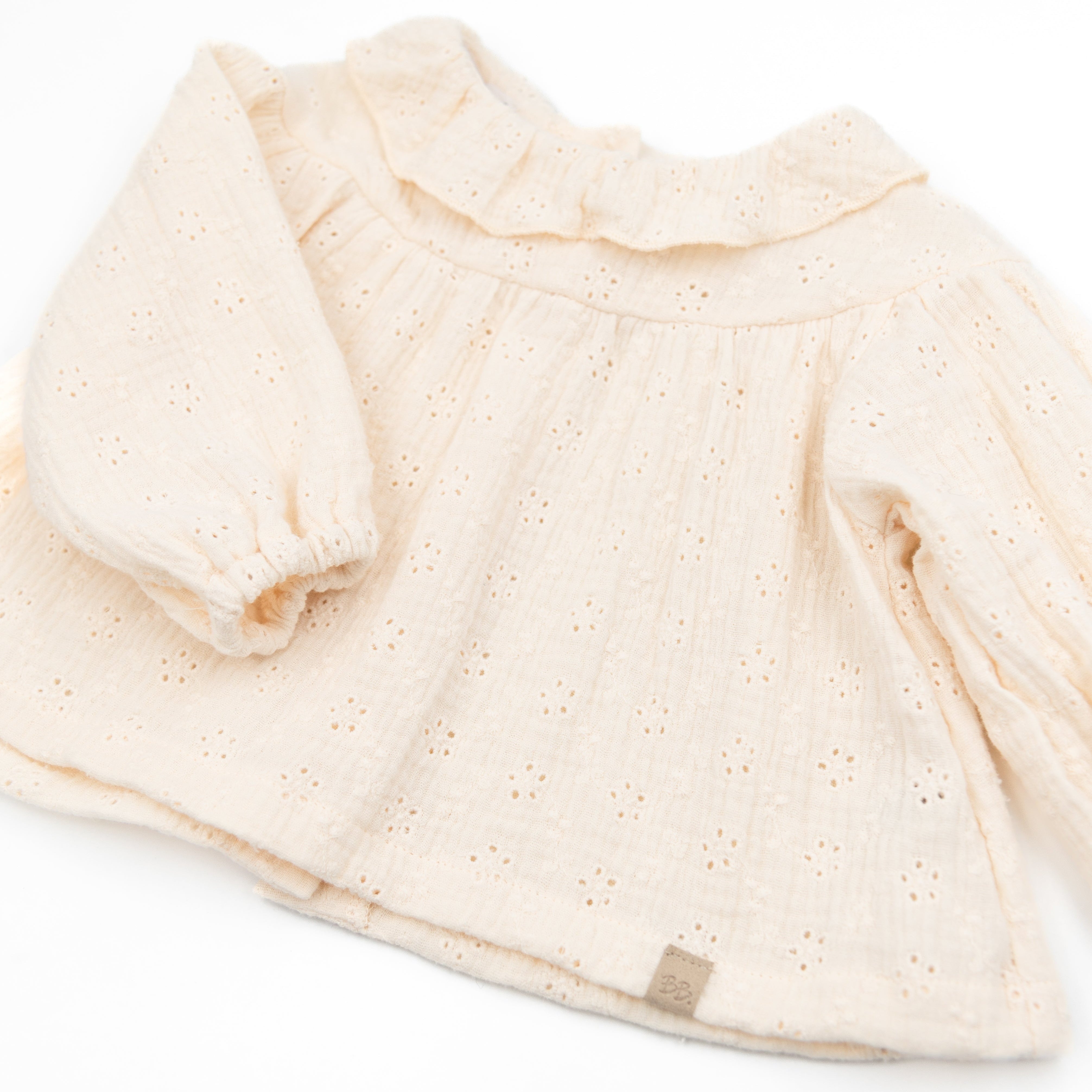 Delicate and refined, the Wide-Collared Shirt adds an elegant touch to every outfit, perfect for special occasions or to elevate simple, everyday looks. The wide ruffled collar, balloon sleeves and slightly flared silhouette create a soft, romantic shape designed for little girls from their first months up to early years.