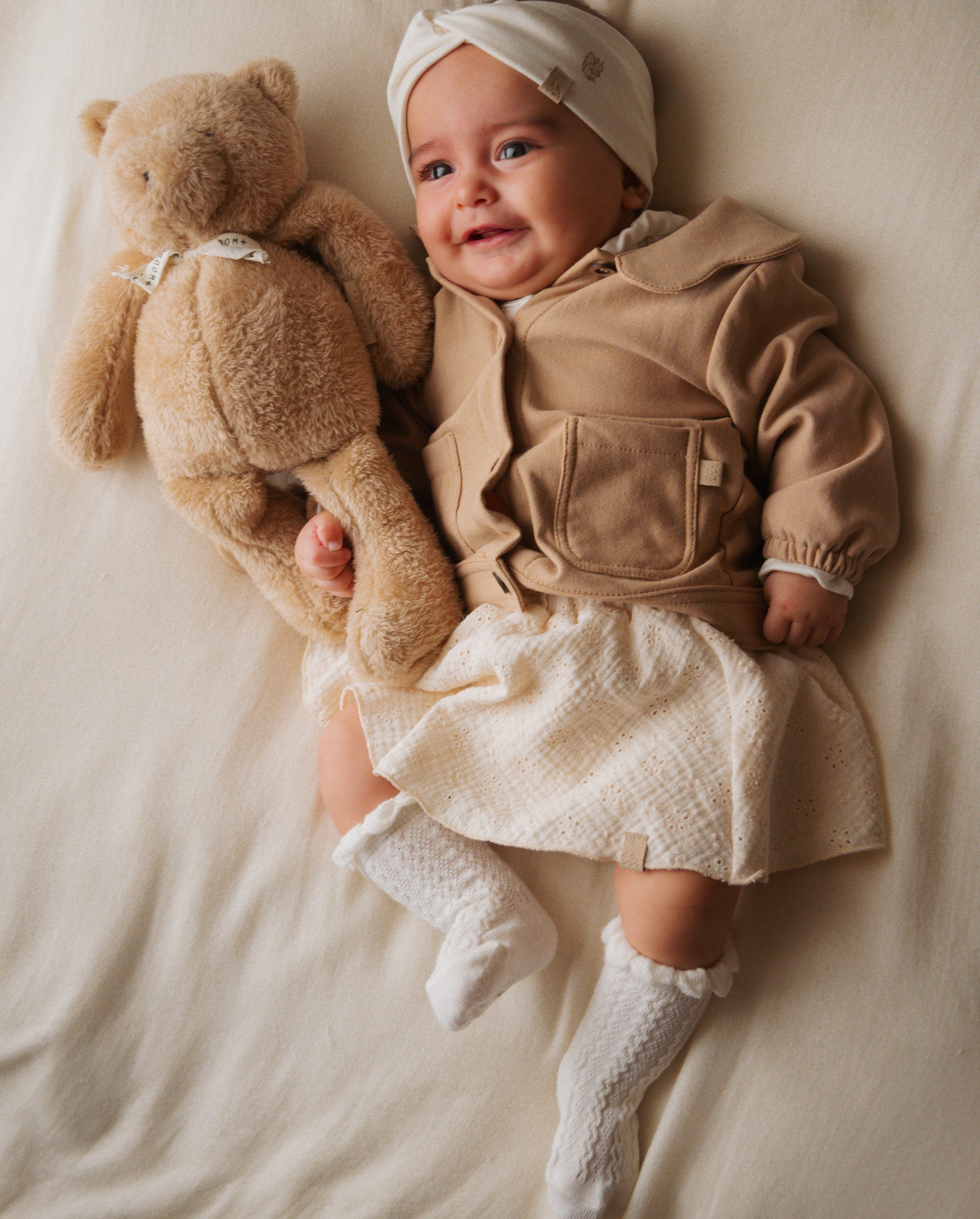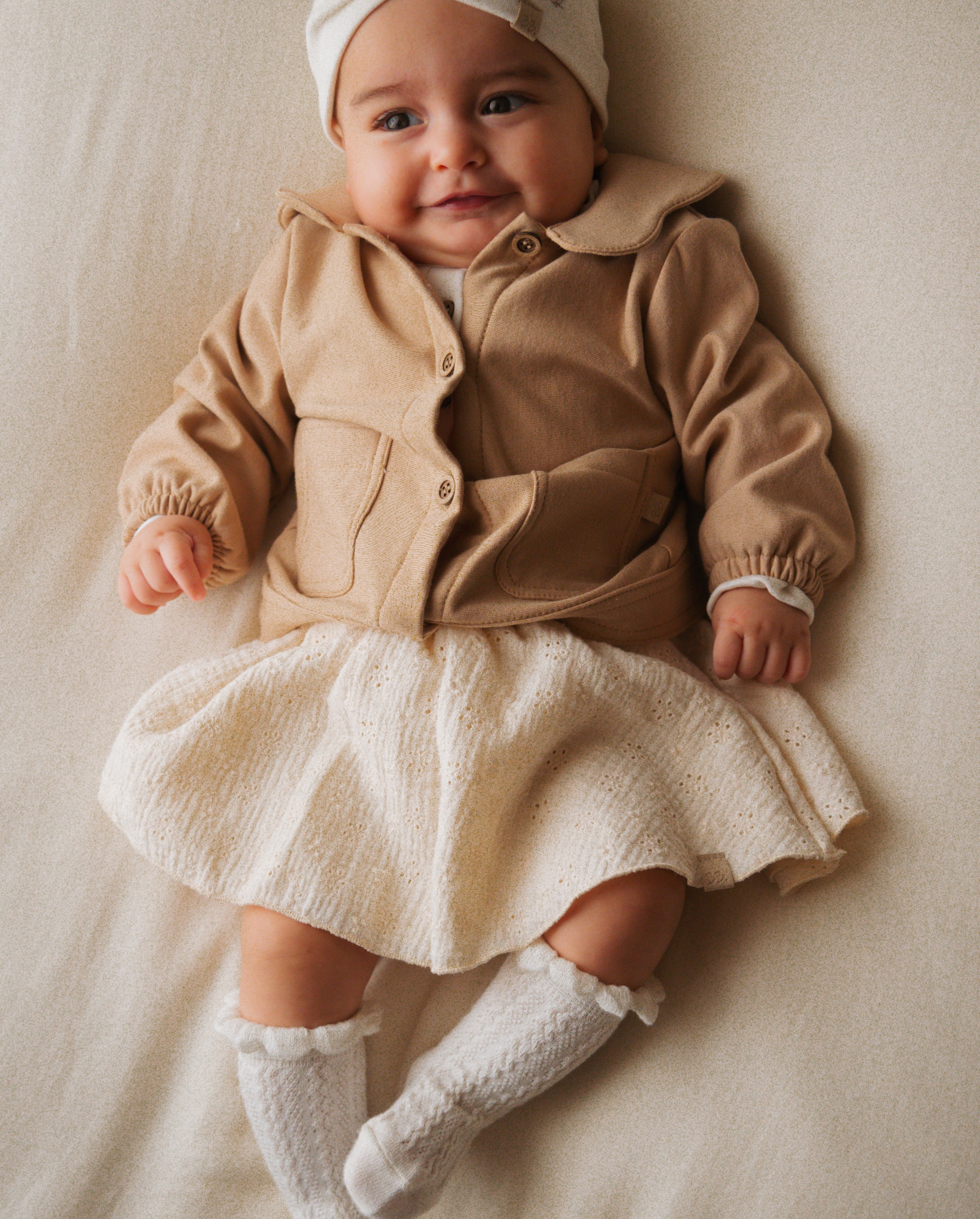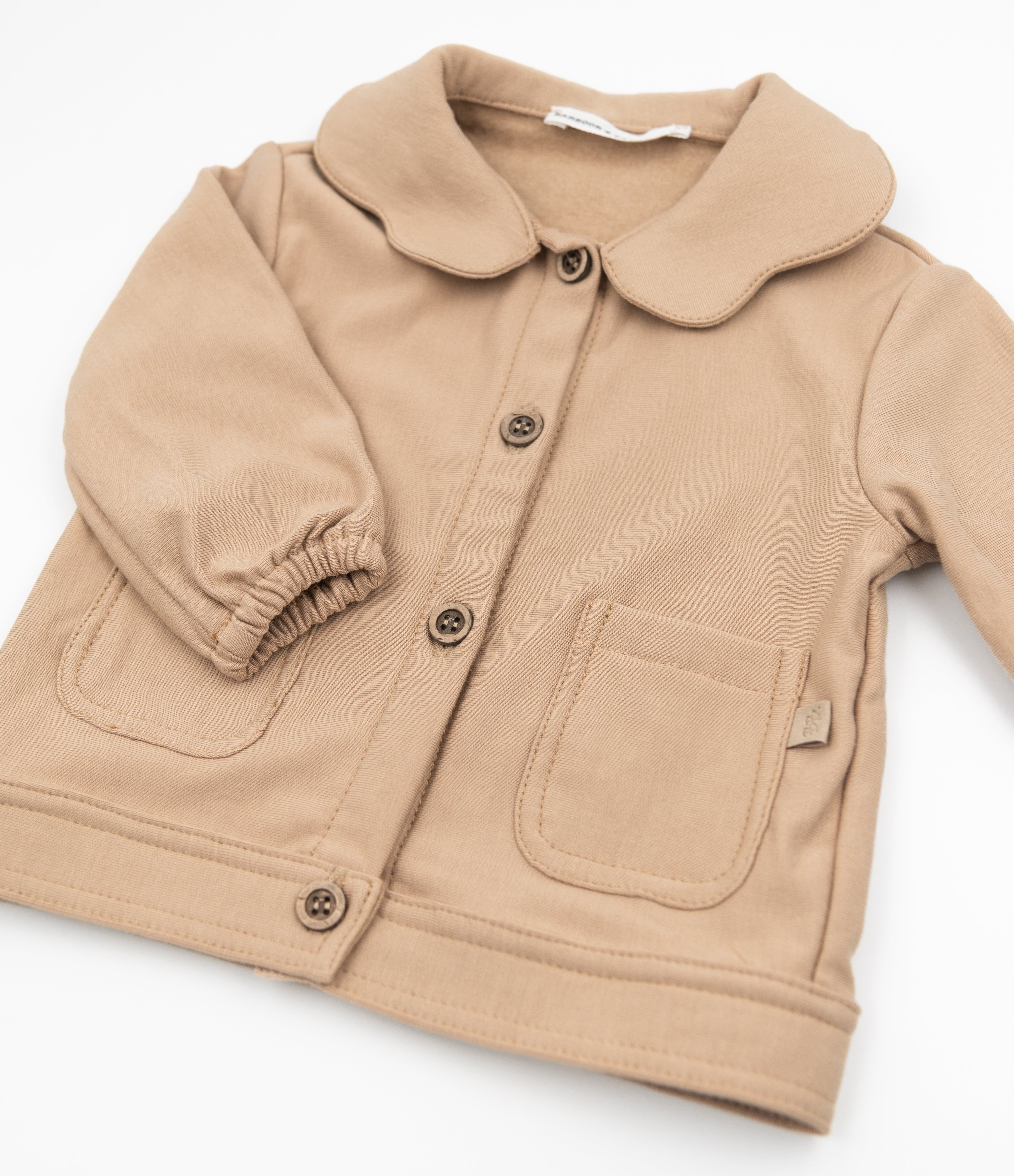 Thoughtfully finished with front pockets, wooden buttons and elastic cuffs, this jacket balances aesthetic appeal and functionality with ease. Ideal to layer over jumpsuits or pants, it accompanies every moment with high sustainable quality, comfort and timeless charm.