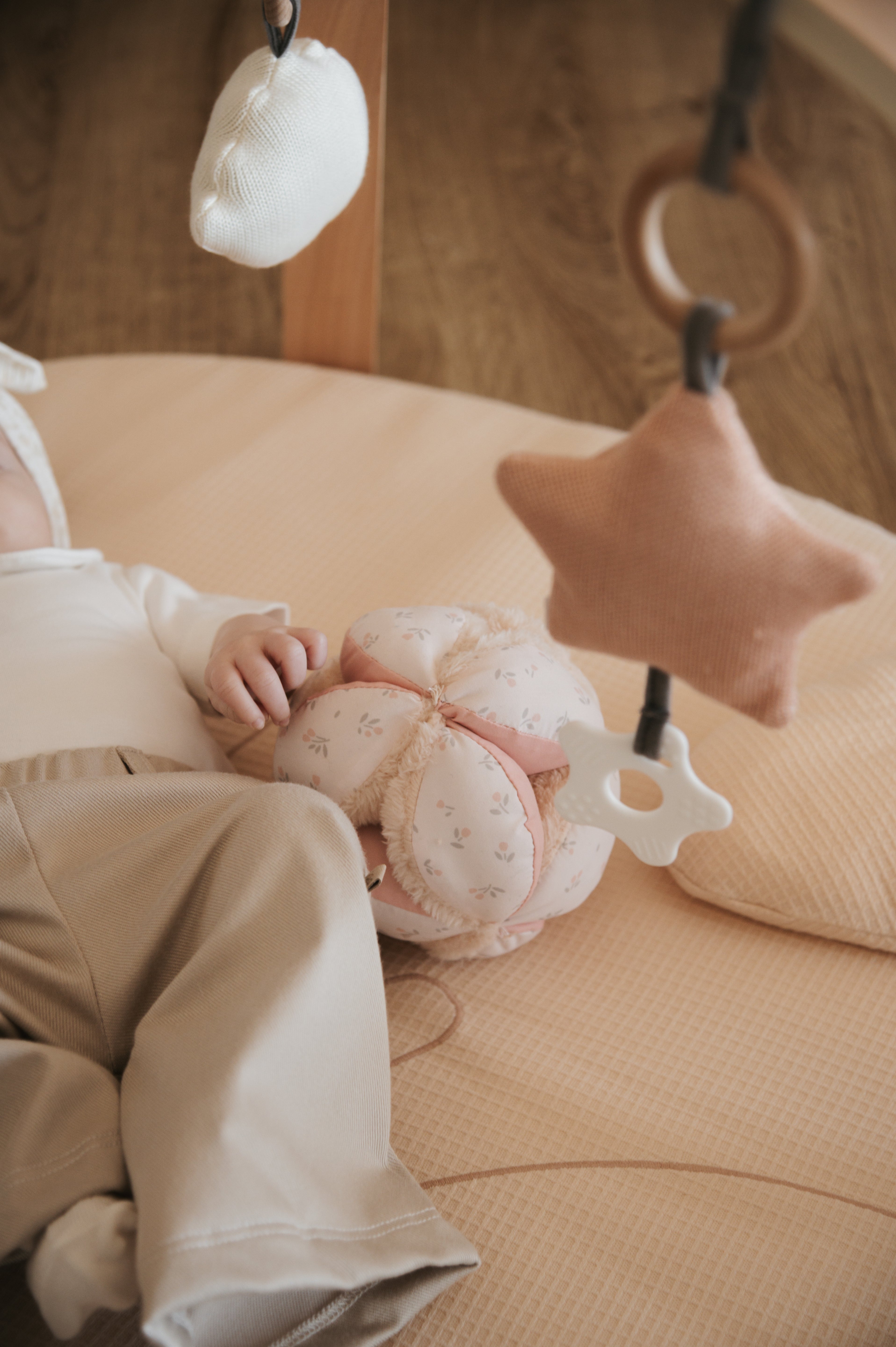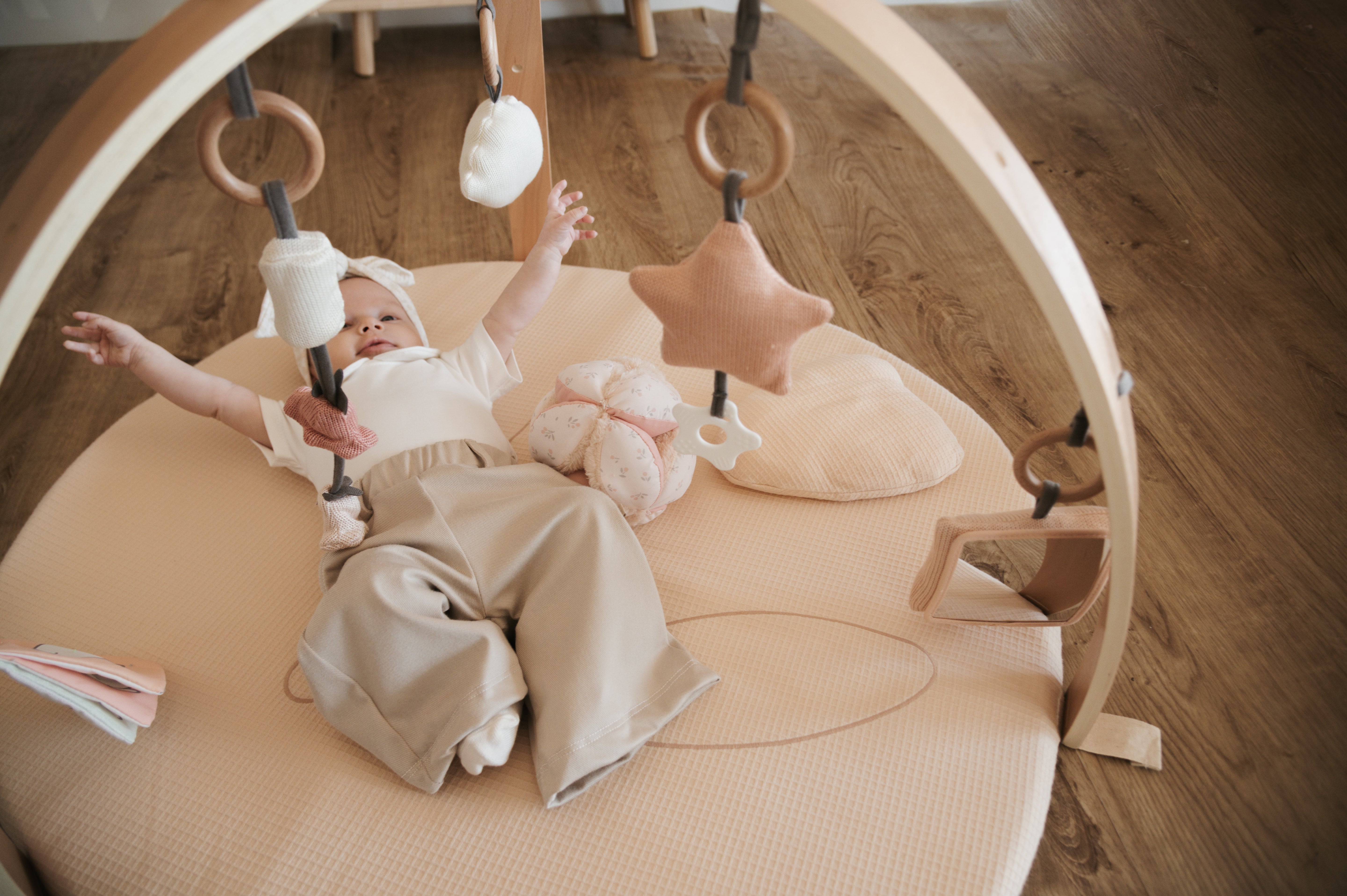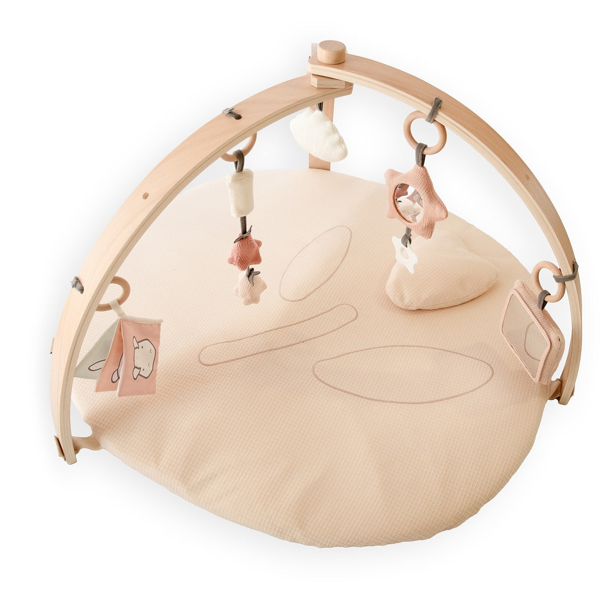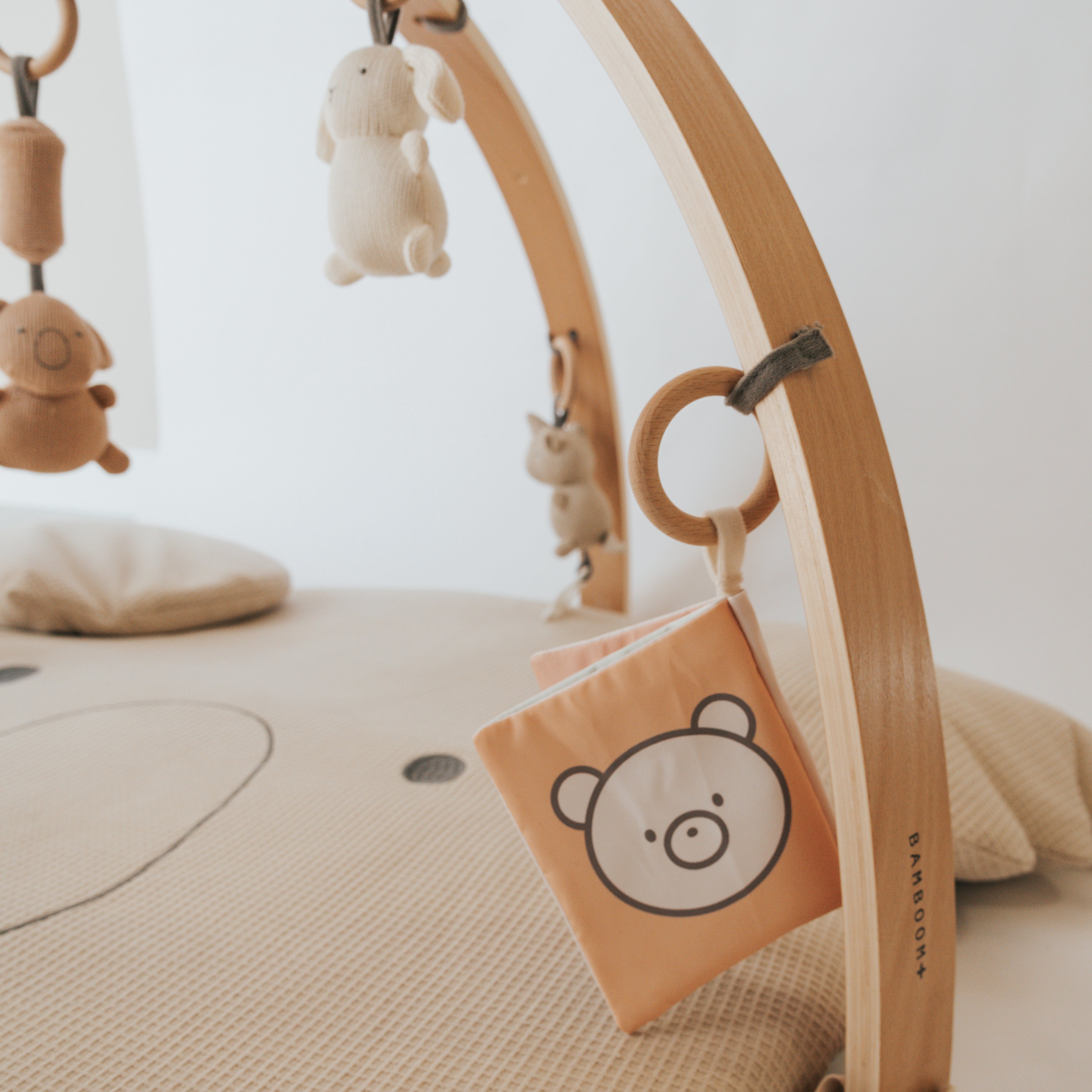 Designed to accompany your child’s early discoveries, this soft, natural play mat promotes cognitive and sensory development in a safe and stimulating way. Made from breathable bamboo mesh and cotton, it’s gentle on delicate skin and perfect for tummy time. Featuring removable sensory toys with Velcro, including a mirror, teether, noisy book, rattles and trumpets, plus multi-purpose inserts like the koala ears, fish tail and tulip flower that double as soft pillows for extra comfort. A perfect blend of fun, safety and learning for your baby’s playtime.