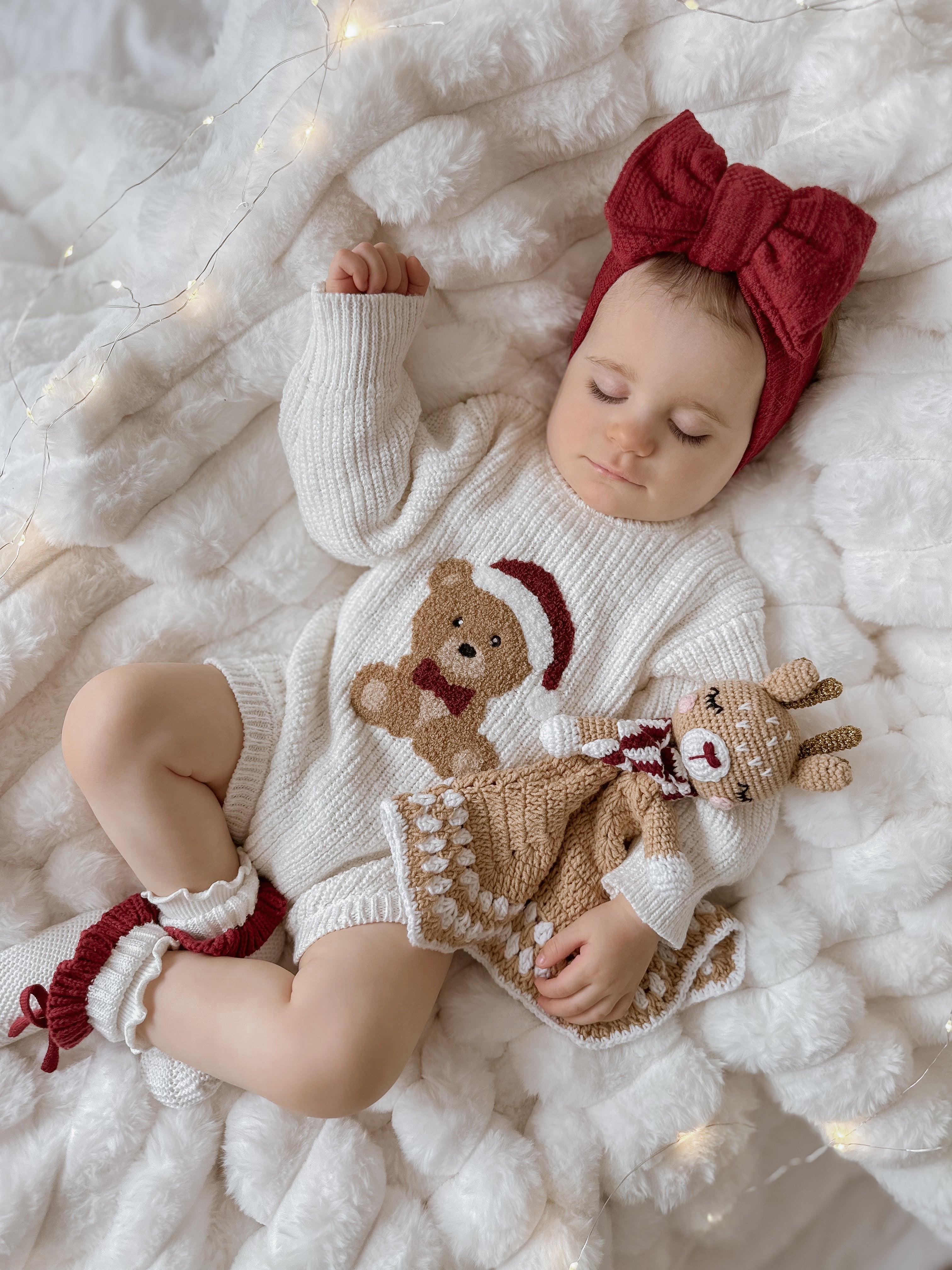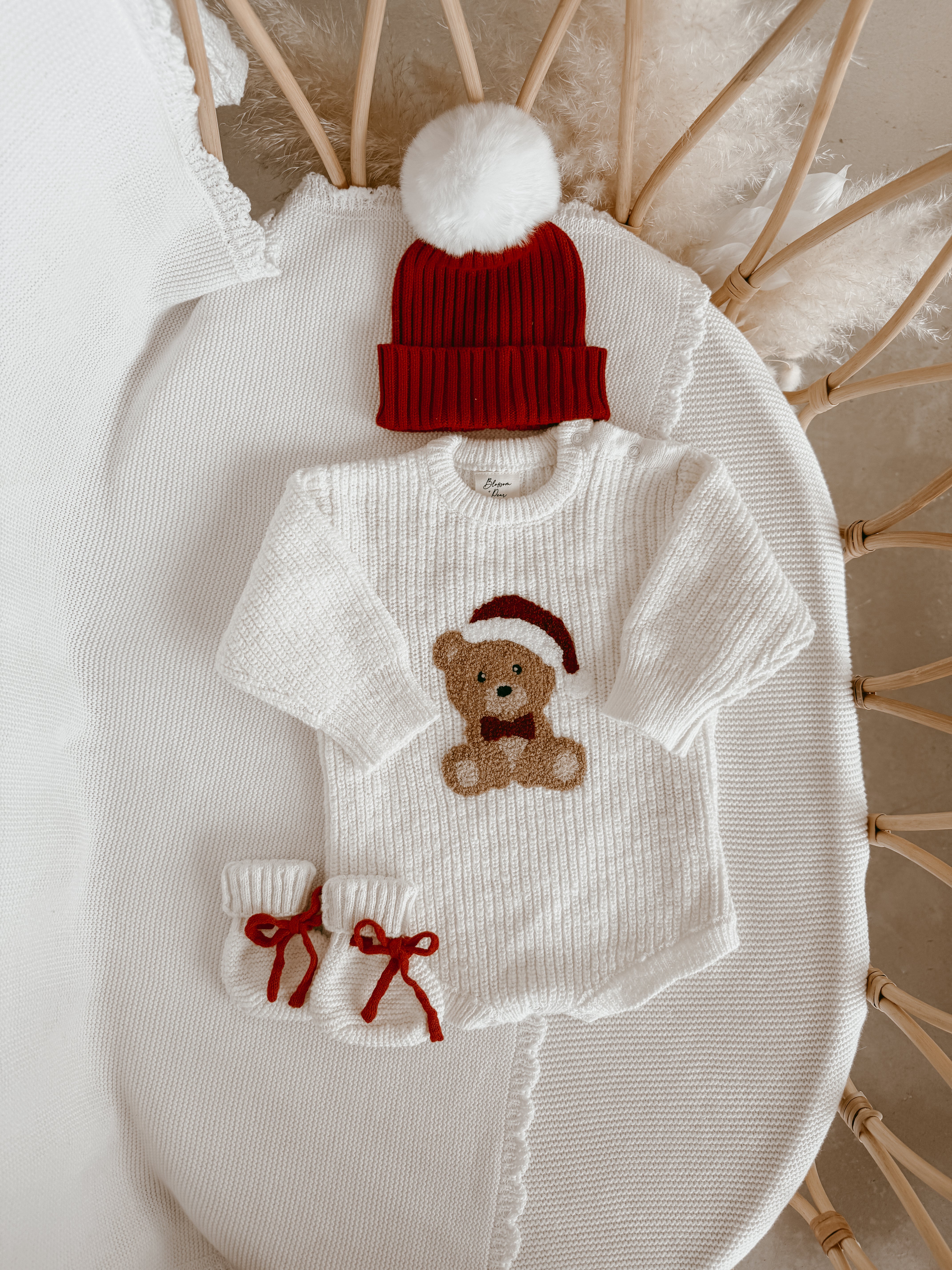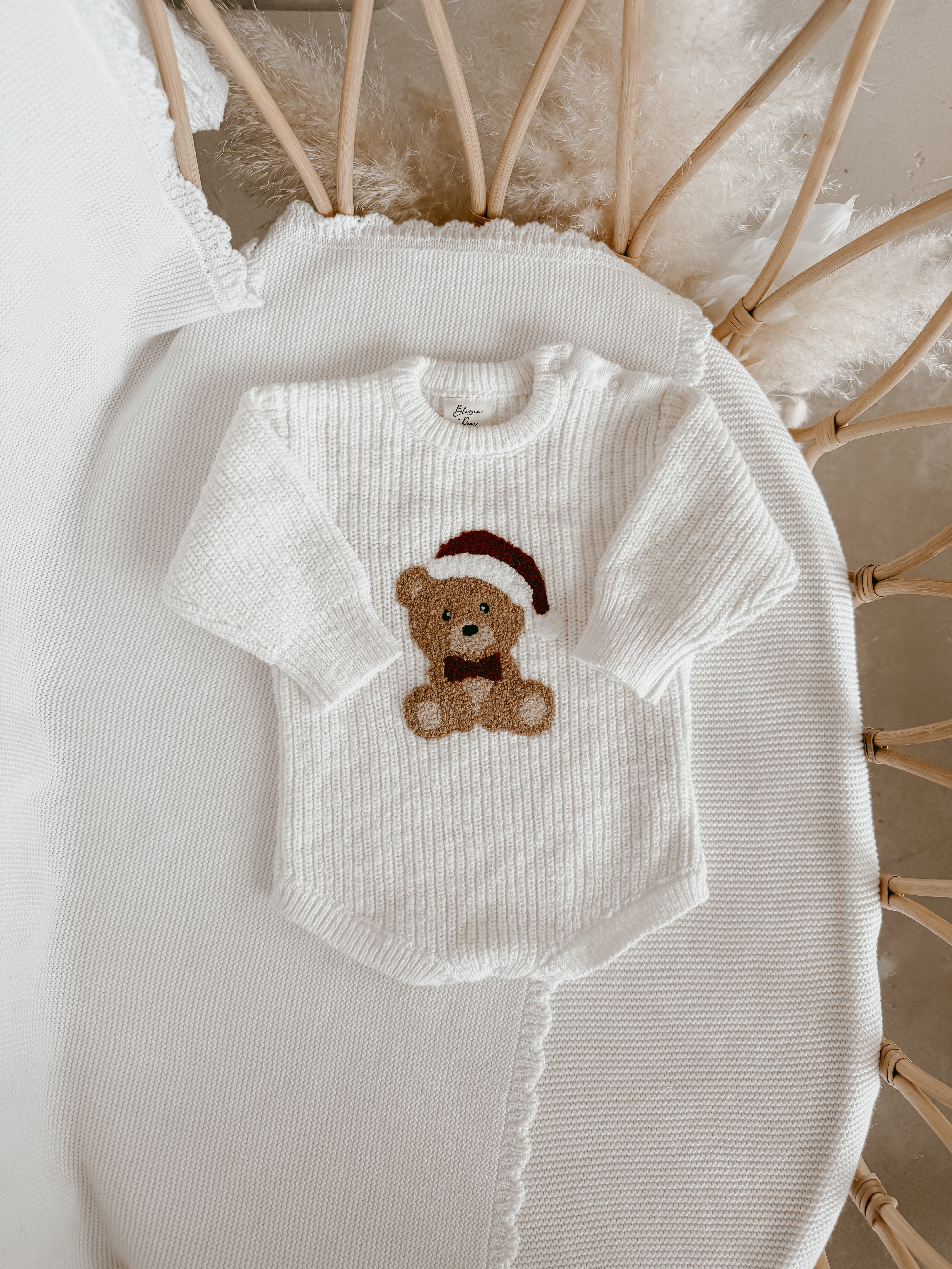 White Knit Christmas Romper with Teddy Bear Embroidery