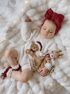 Snuggle up your little one this holiday season with these adorable white knit rompers. Made from soft cotton and finished with a sweet teddy bear embroidery, it is cosy, charming and perfect for matching with our Christmas booties and beanies.