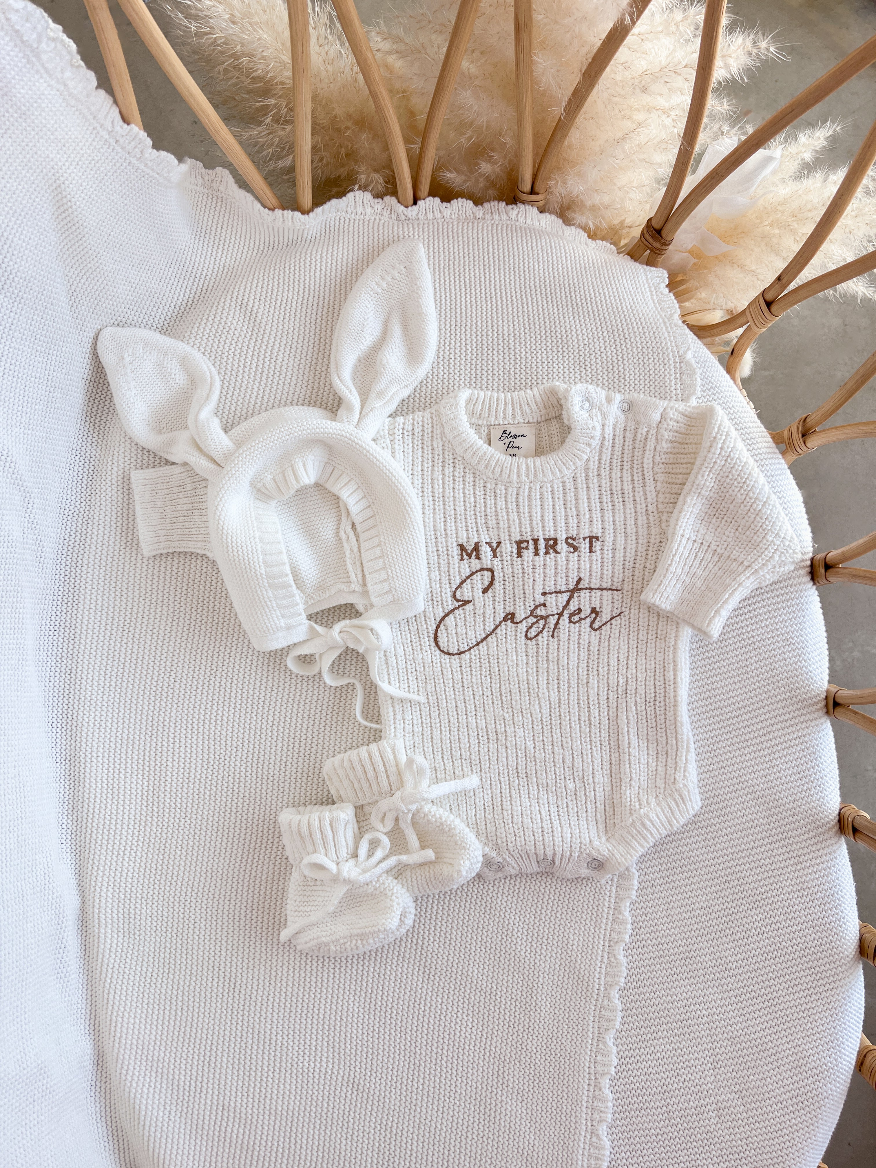 Celebrate your little love’s very first Easter in the sweetest way with our cosy ‘My First Easter’ Knit Romper. Crafted from beautifully soft white cotton and delicately embroidered, it is a timeless keepsake made for precious memories and photo moments.