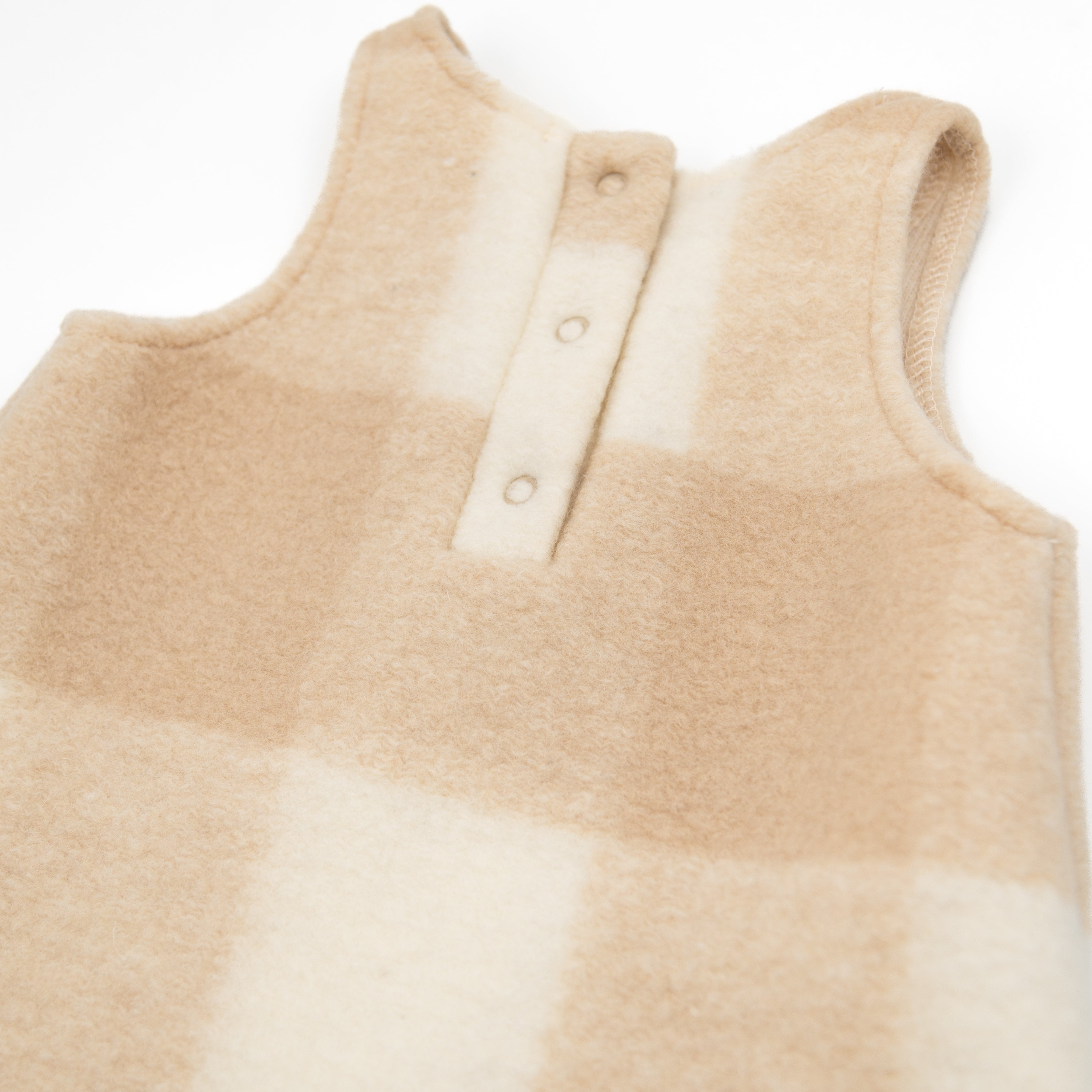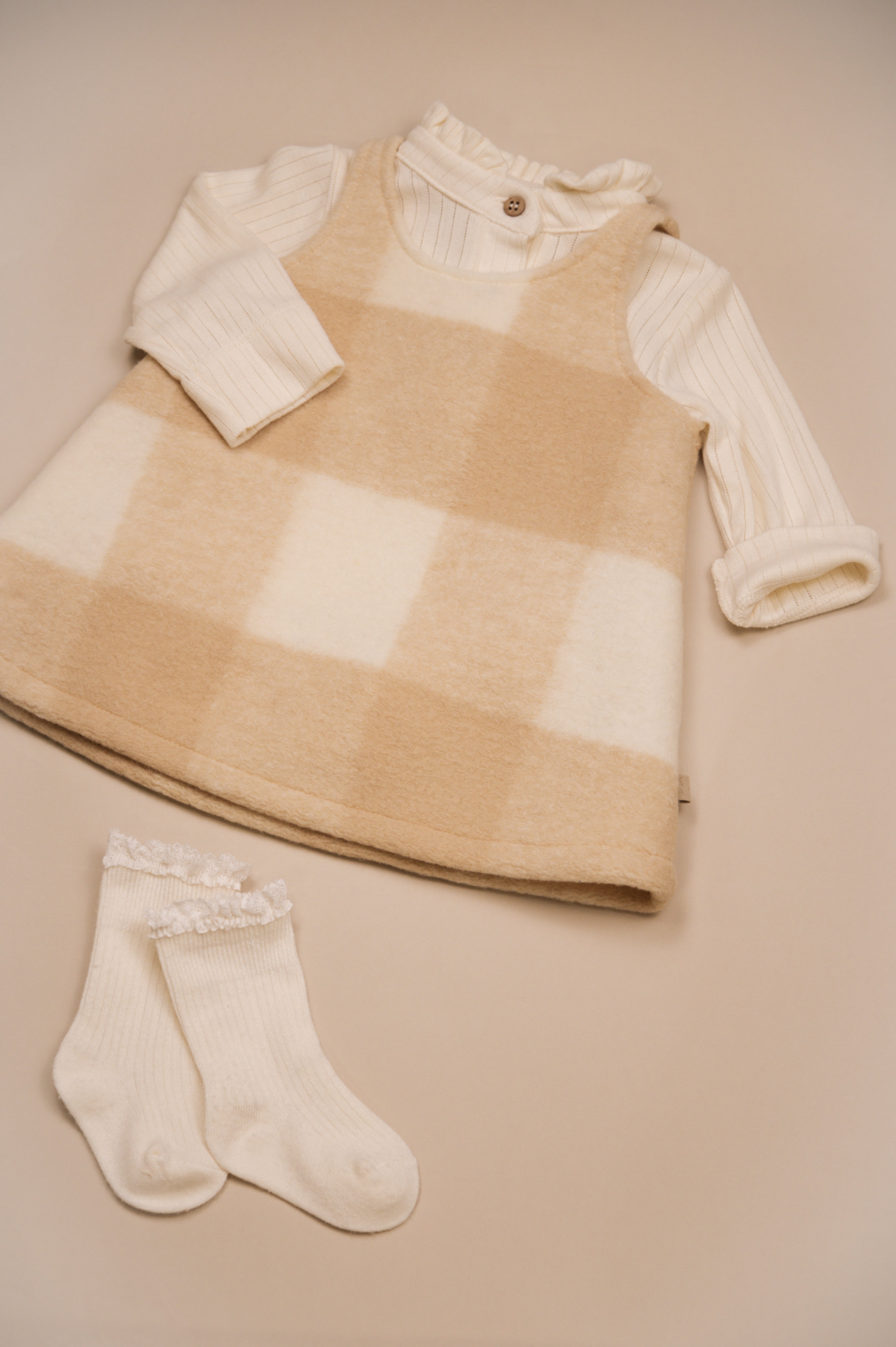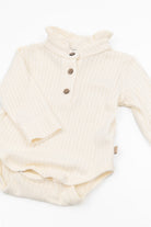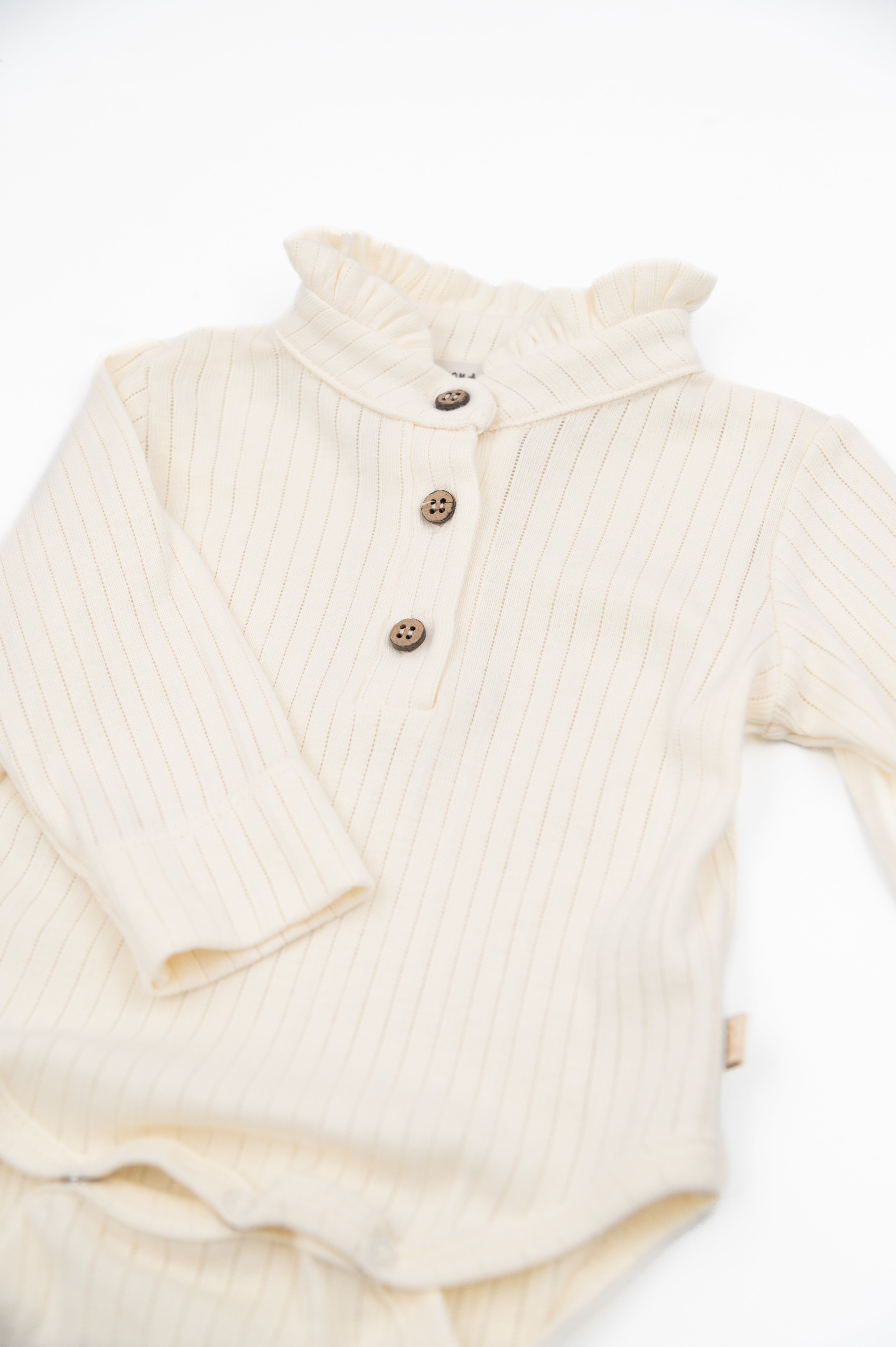 The gathered ruffle collar and wooden buttons on the front add a refined, timeless charm, while the snap-button opening at the crotch ensures quick and easy changing.