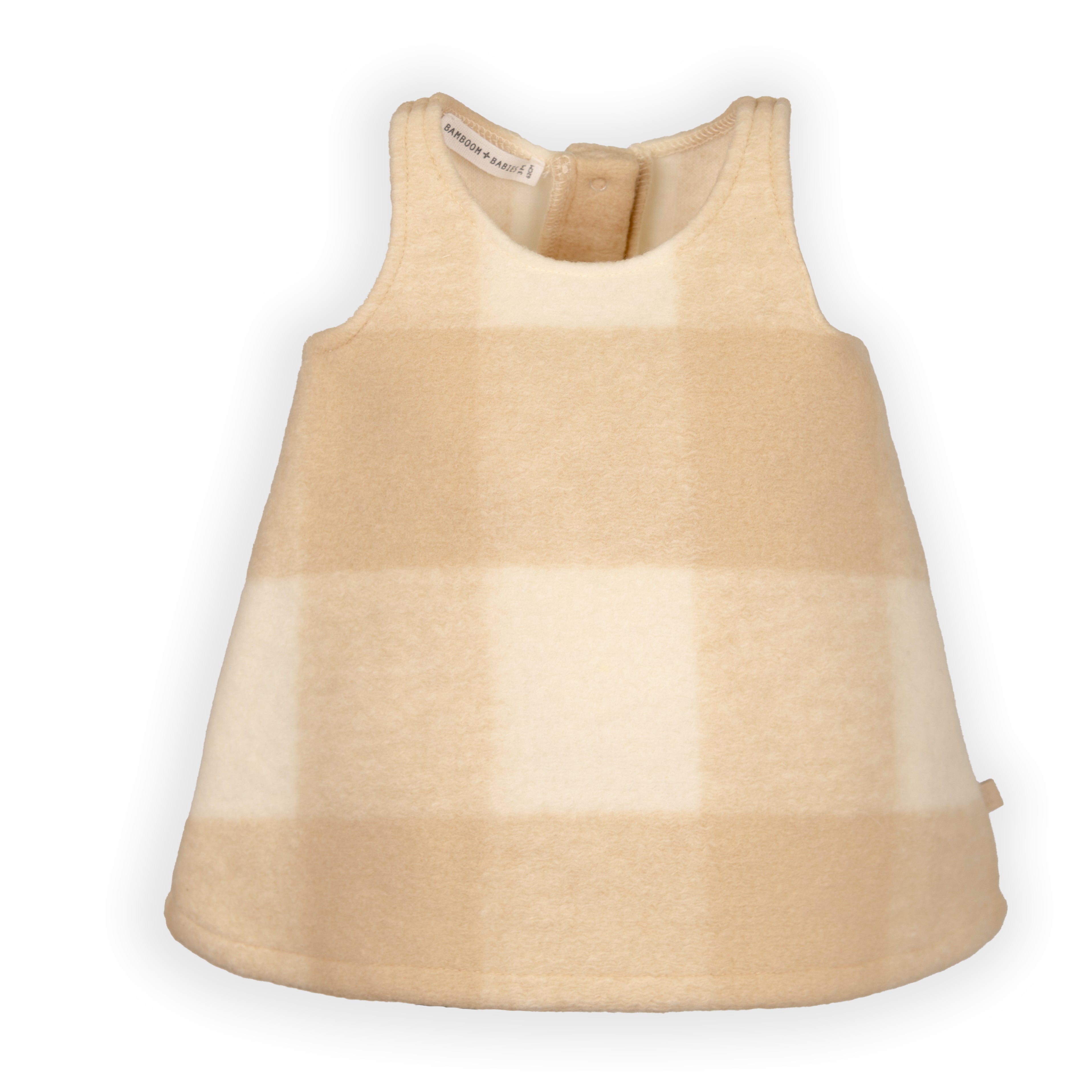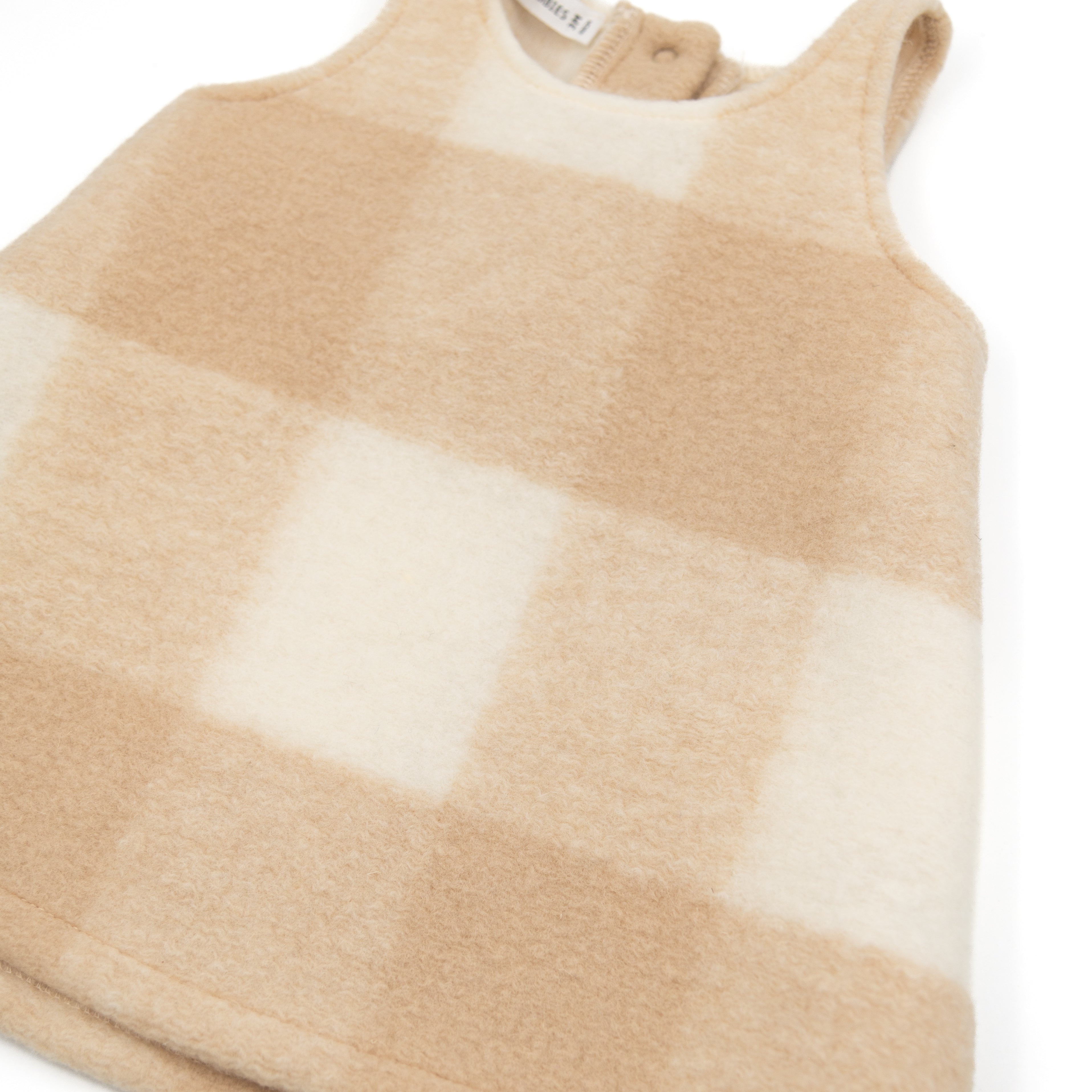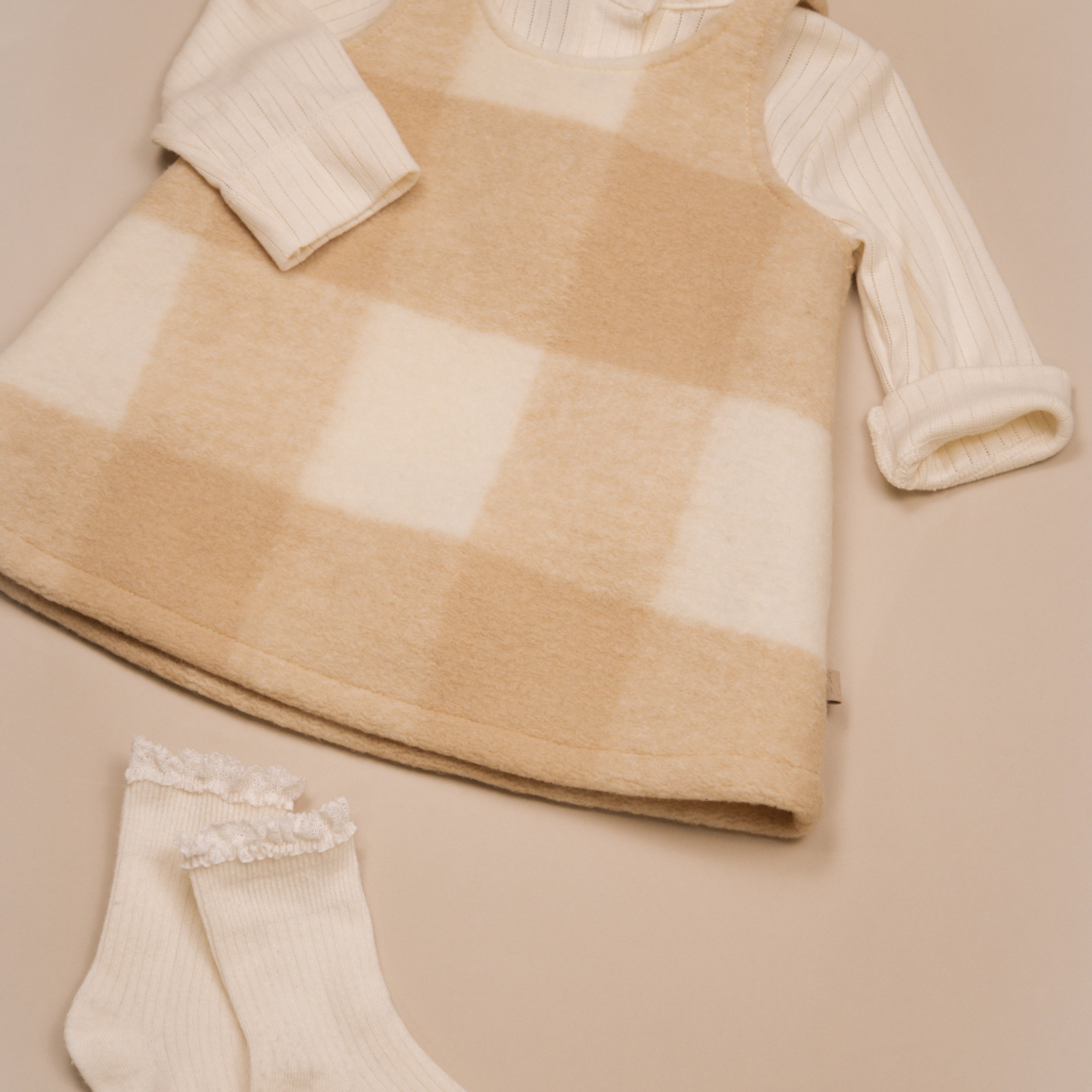 The gathered ruffle collar and wooden buttons on the front add a refined, timeless charm, while the snap-button opening at the crotch ensures quick and easy changing.